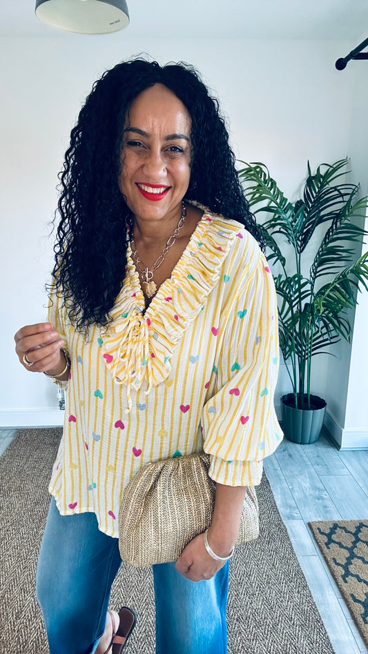 PRE ORDER ALEX STRIPED RAW EDGE BALLOON SLEEVED JUMPER CHOCOLATE BROWN & YELLOW *New