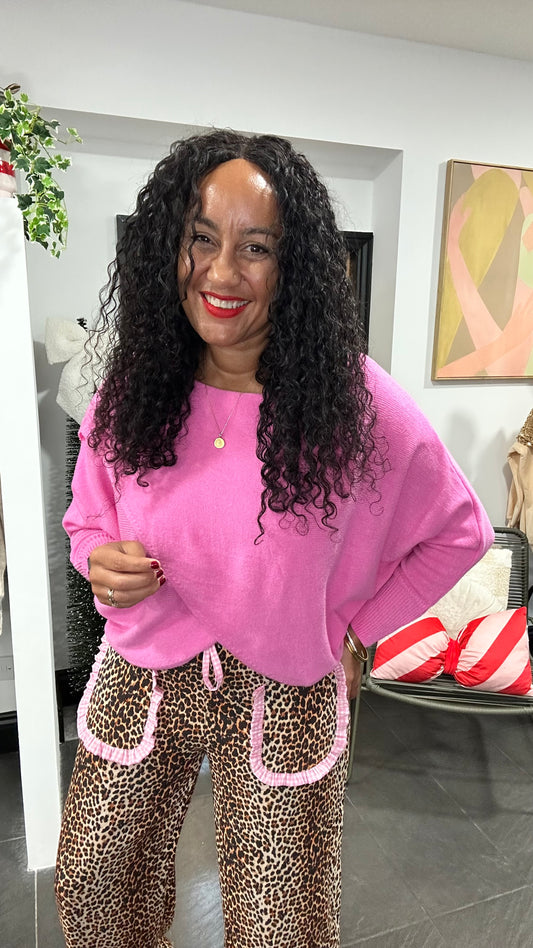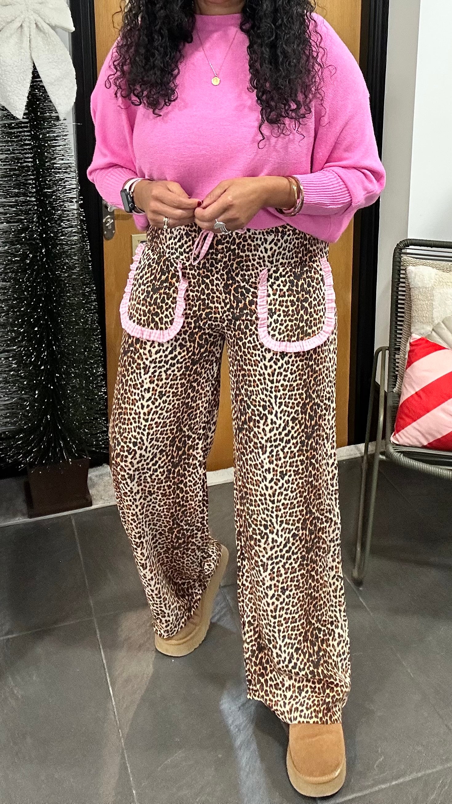 PRE ORDER DAISY LEOPARD PRINT WIDE LEG TROUSERS WITH PINK CONTRAST *New