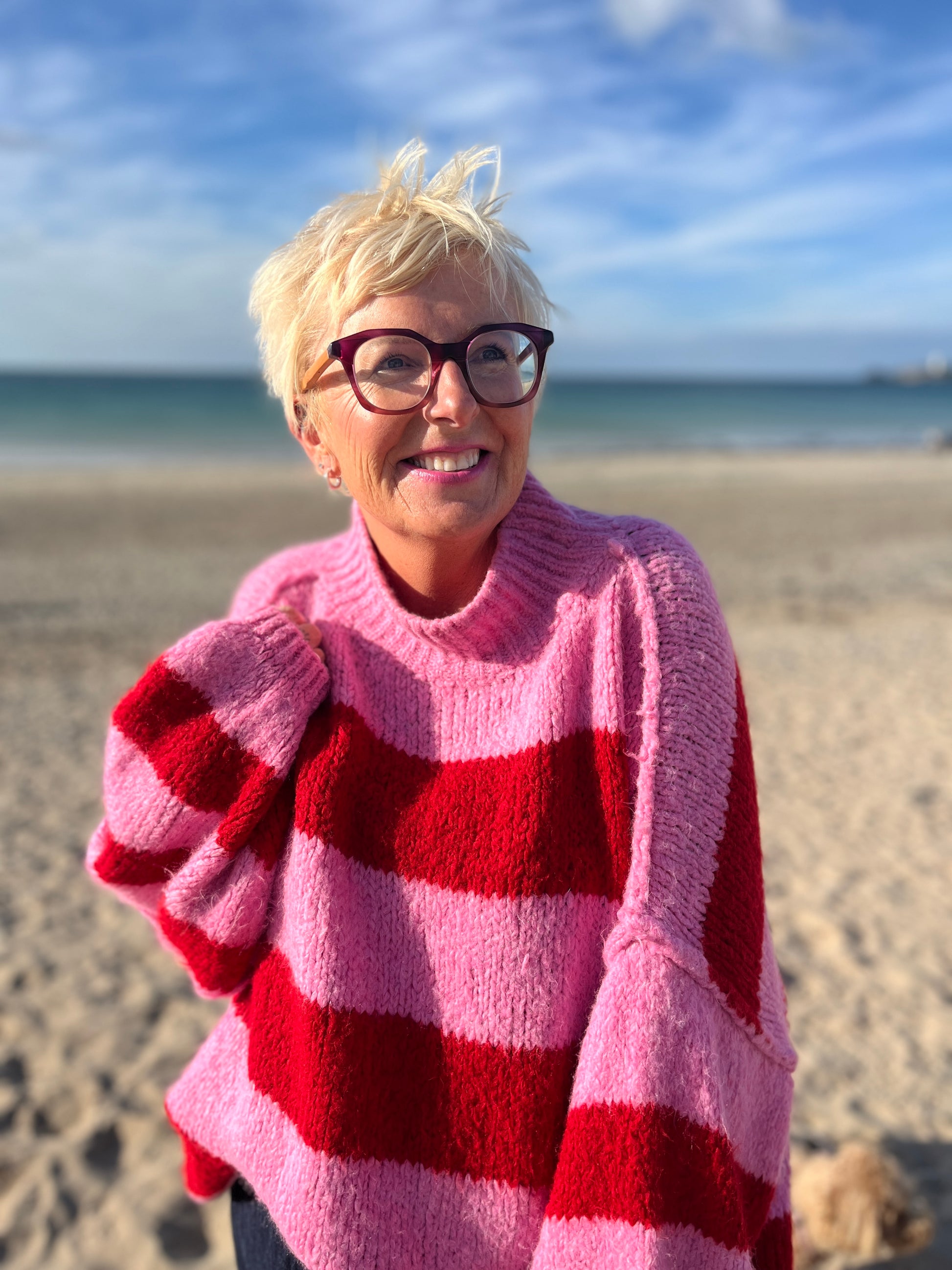 ALEX STRIPED RAW EDGE BALLOON SLEEVED JUMPER CANDY CANE RED & PINK *New