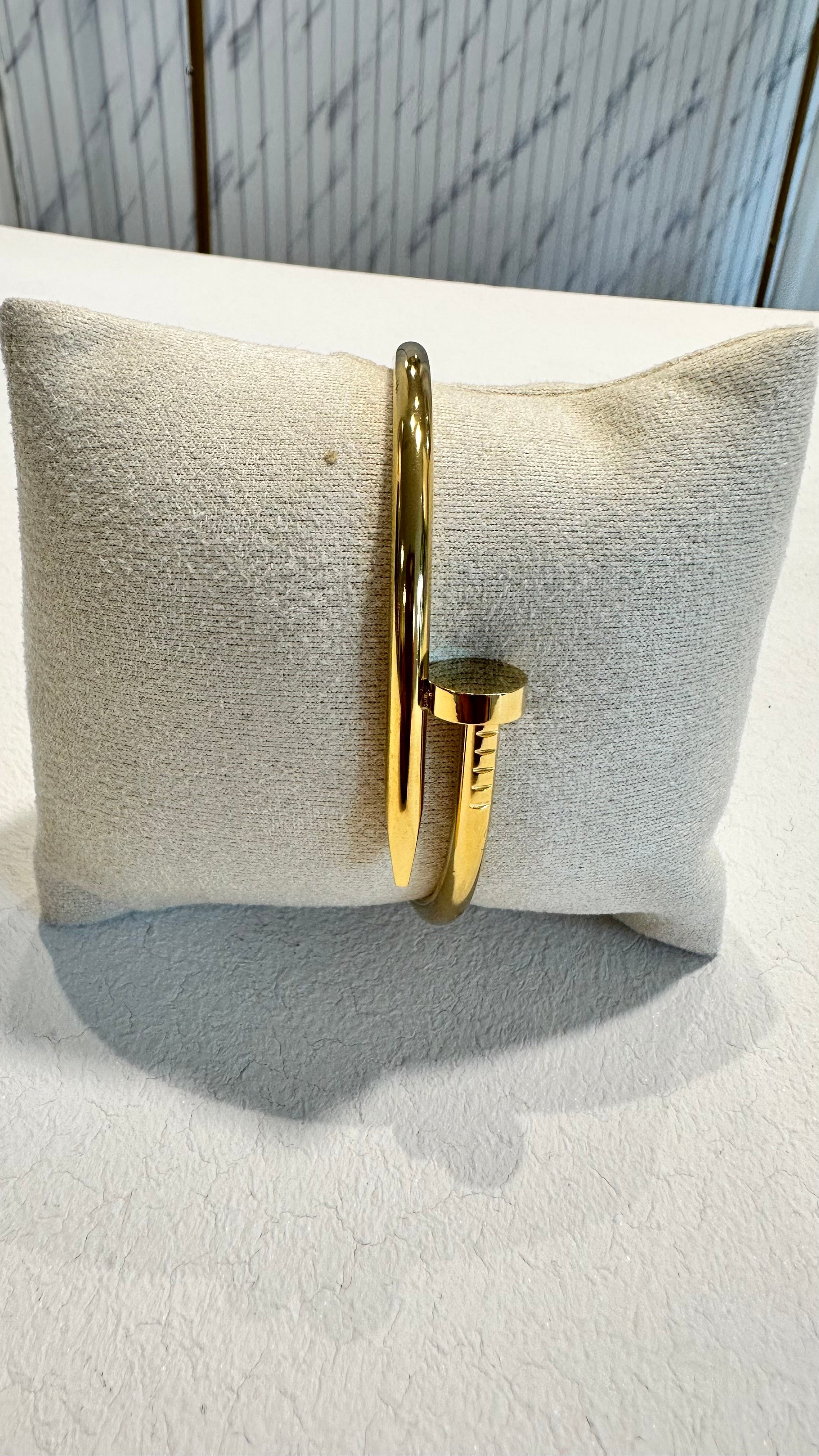 Perfect for stacking or wearing solo, this versatile piece adds an edgy-luxe touch to any outfit. Whether dressed up or down, the Nail Head Bangle Bracelet is a must-have accessory for the modern trendsetter.