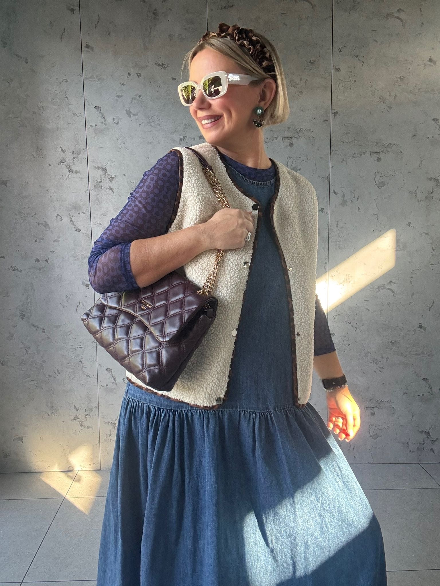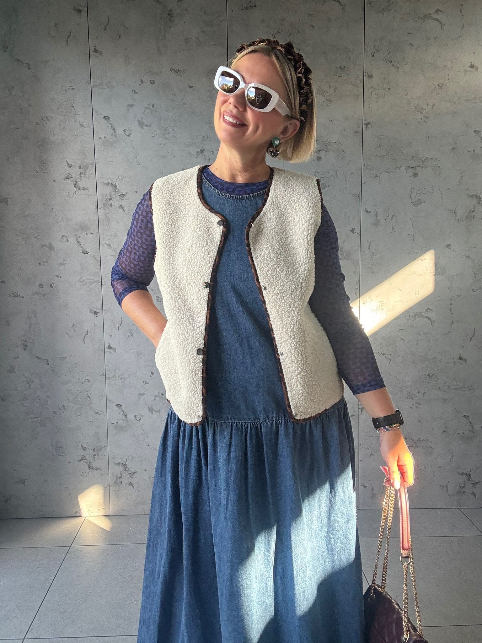 This versatile gilet is the perfect layering piece for in between days. Crafted in a soft, textured Borg finish with a sleek popper front, it offers light warmth without added bulk ideal over knitwear or long-sleeved tops.