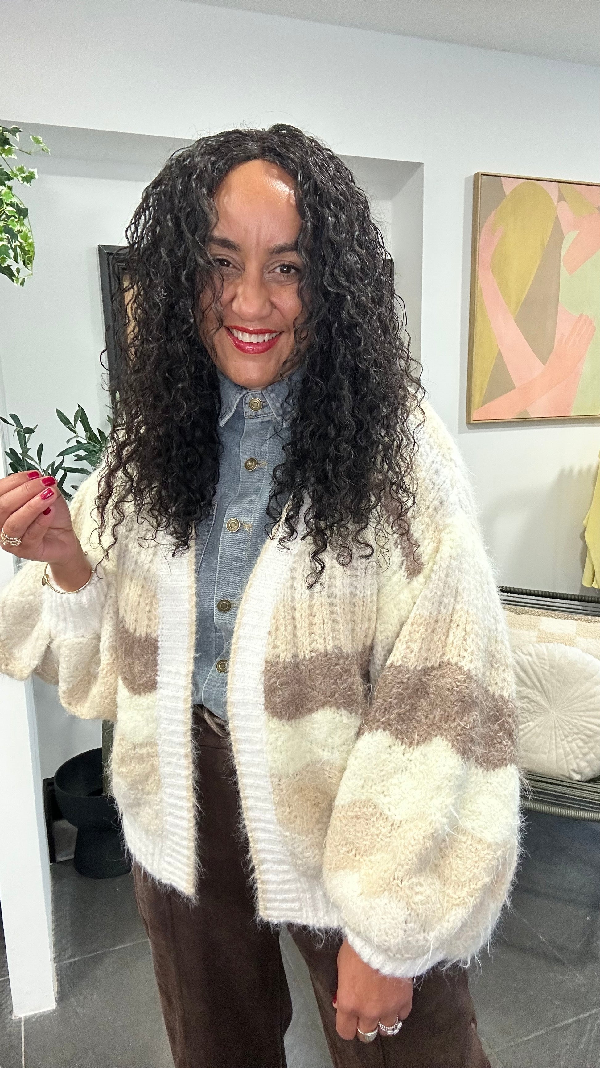 Wrap yourself in effortless comfort with our Vanilla Latte Cloud Knit Cardigan, a beautifully soft layering piece in the dreamiest neutral tones. Blending creamy vanilla, warm oat and subtle latte stripes, this cardigan is designed to elevate your everyday wardrobe with cosy sophistication.