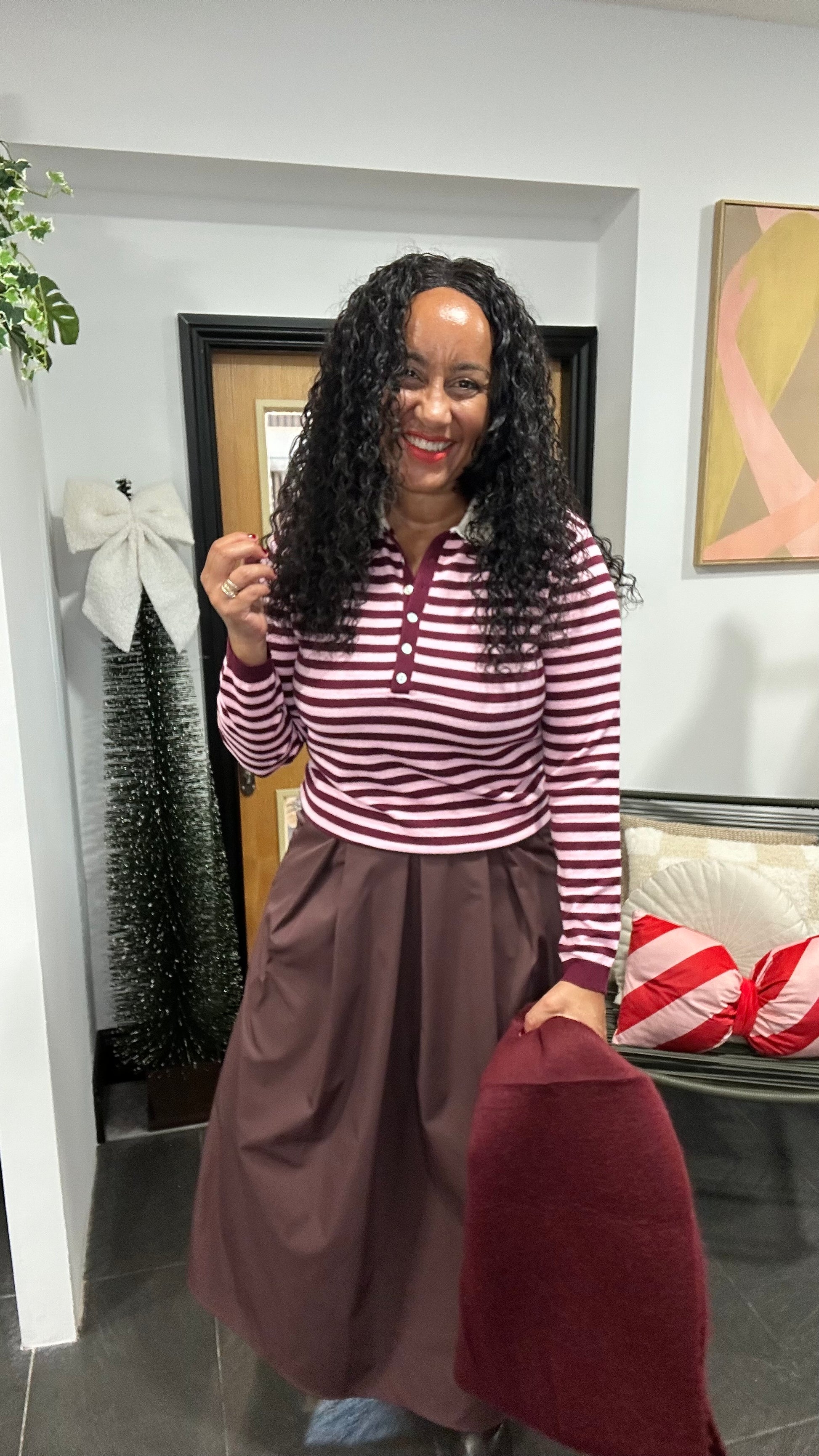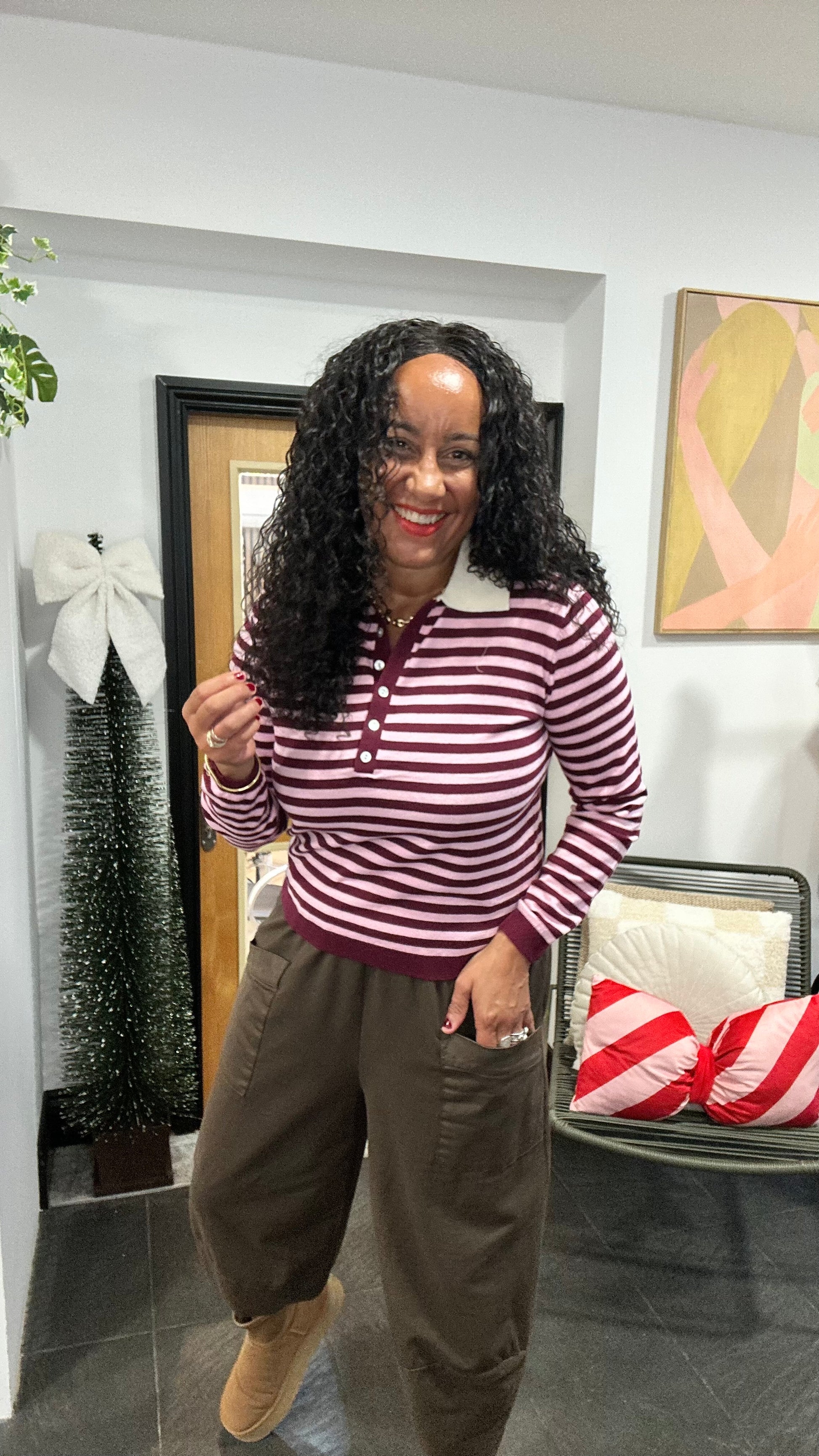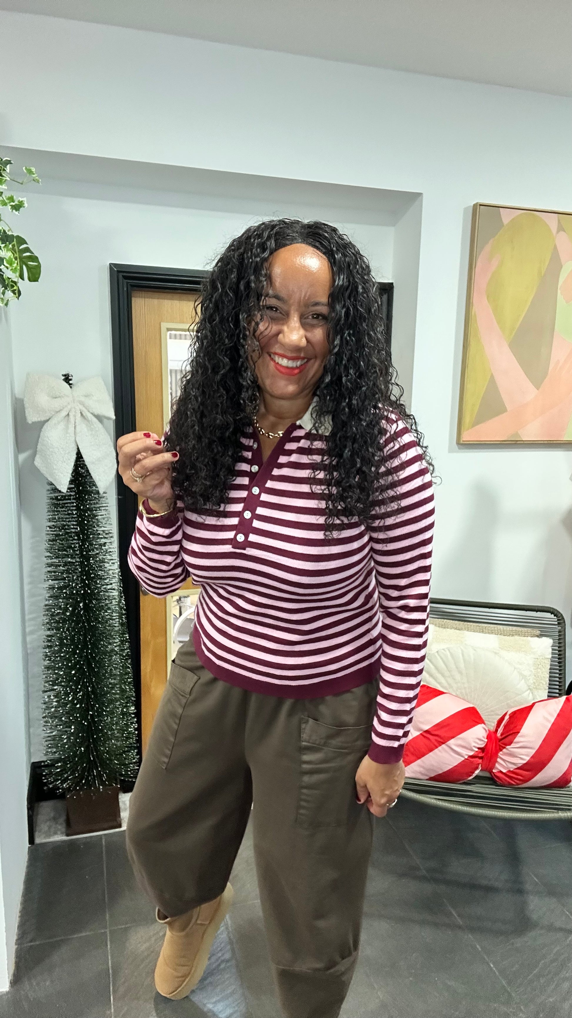 This cozy striped knit top pairs timeless style with modern comfort. Featuring rich burgundy and soft pink stripes, an ivory contrast collar, and a classic button-neck design, it offers a refined yet relaxed look. The knit fabric provides gentle stretch and all-day ease, making it a perfect go-to piece for cooler seasons. Chic on its own or layered under jackets and vests.