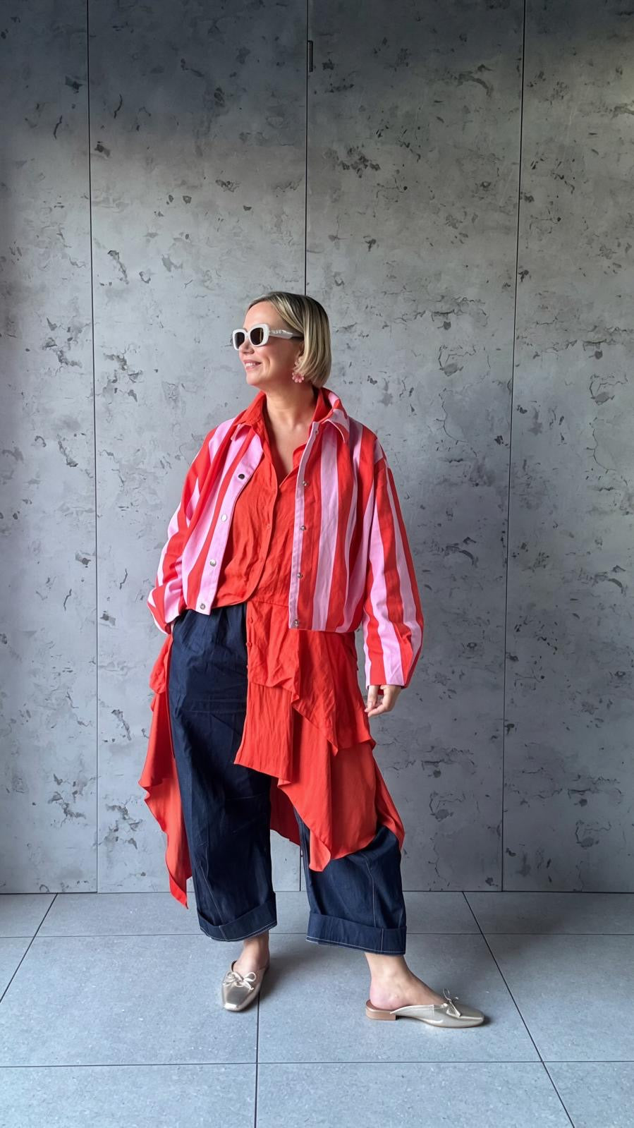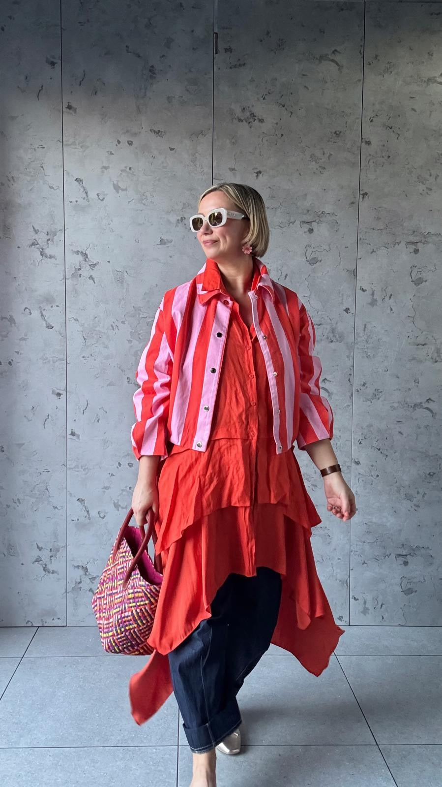 Turn heads with this bold striped statement jacket, designed to bring playful sophistication to any outfit. Featuring striking vertical red and pink stripes, this eye-catching piece blends modern style with effortless comfort.