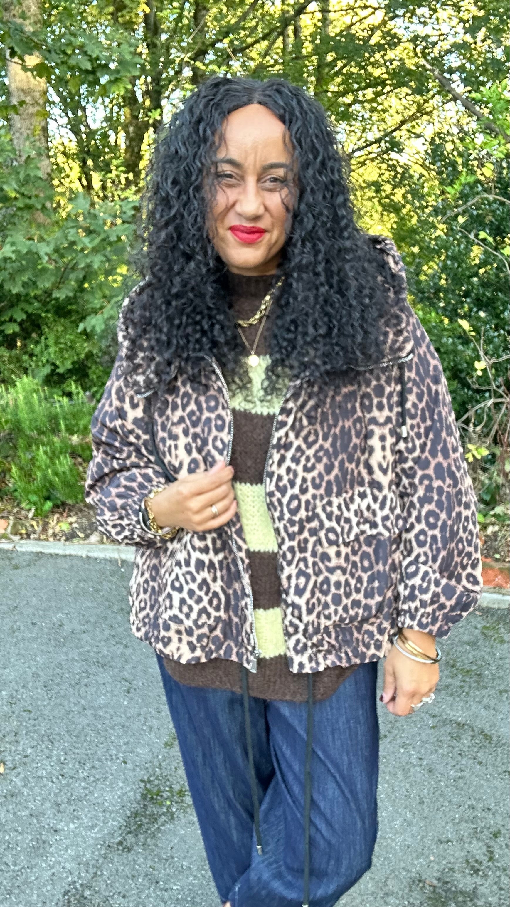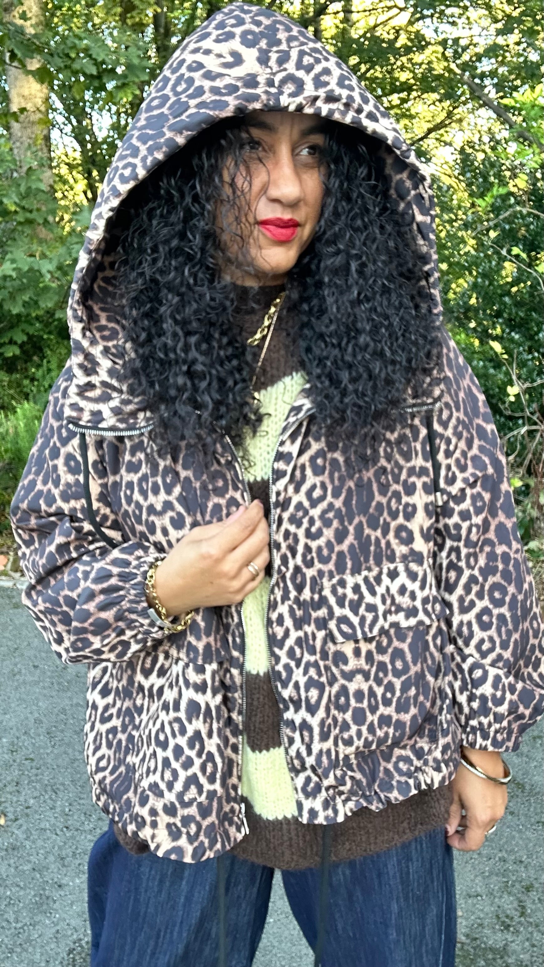 Statement leopard print jacket. Designed with a relaxed fit, it features a zip-front closure, elasticated cuffs, and a drawstring hem for adjustable comfort. The oversized hood adds a practical yet stylish touch, while the bold animal print ensures you stand out effortlessly.