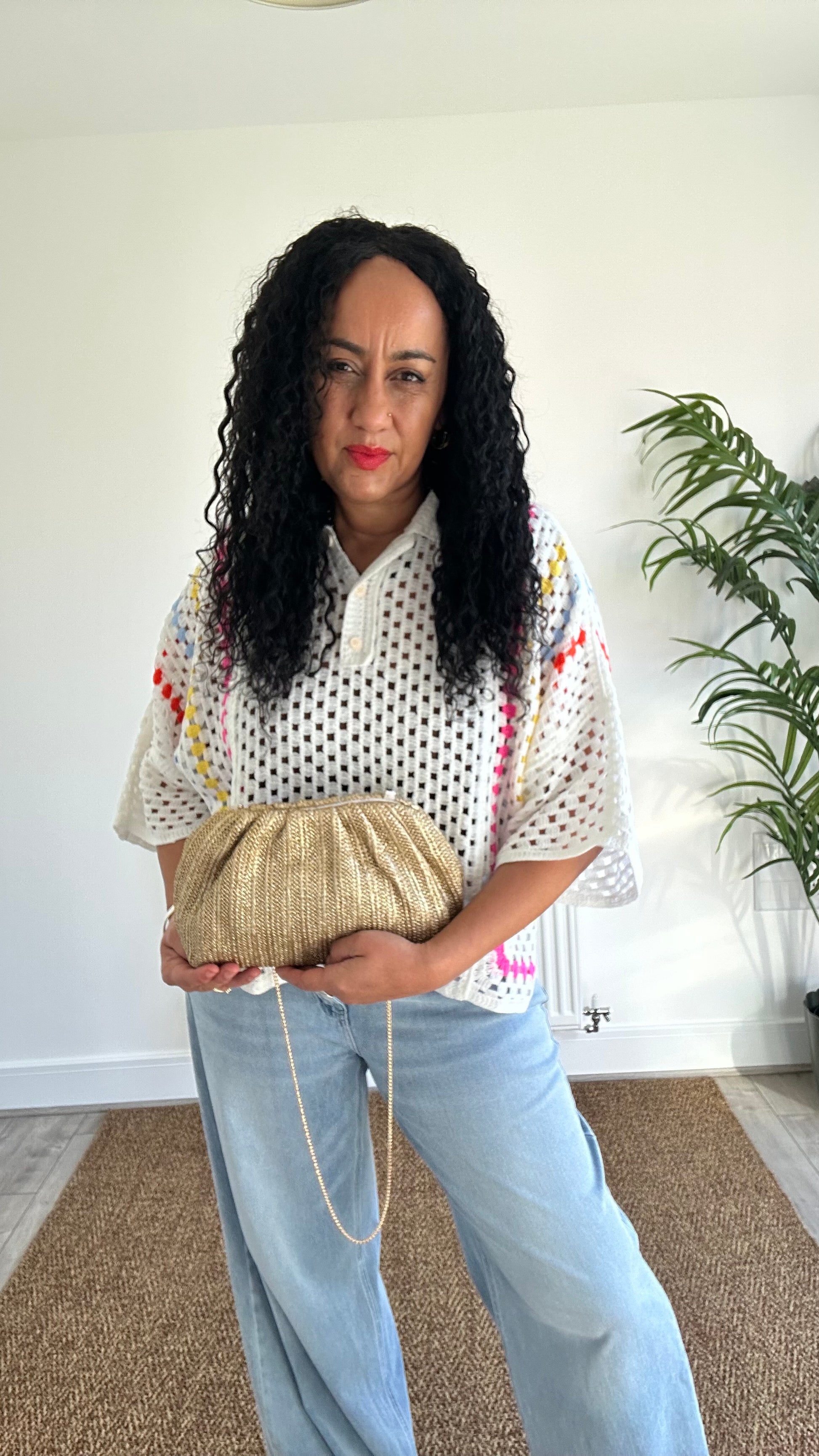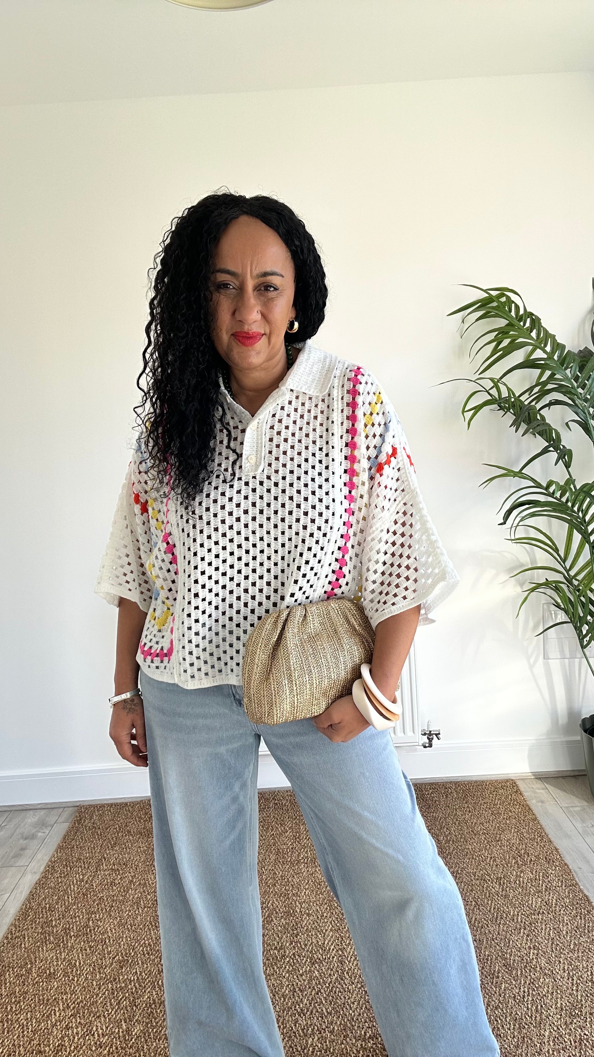 The relaxed silhouette is complemented by a classic polo-style collar and button detail, giving it a modern twist on a timeless design. Subtle multicolour woven accents add a vibrant pop of colour against the soft neutral base, making this piece easy to pair with denim, linen trousers, or skirts.