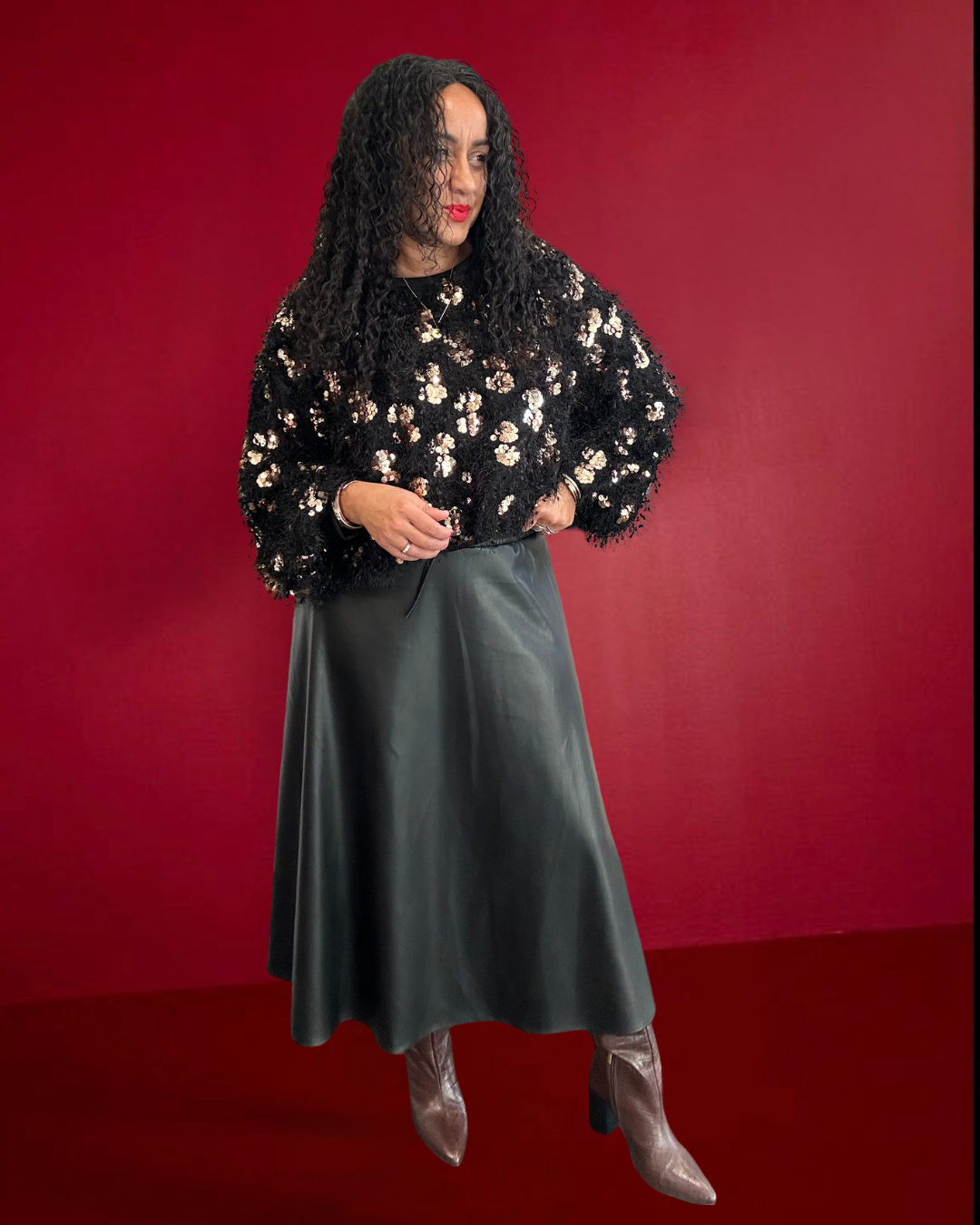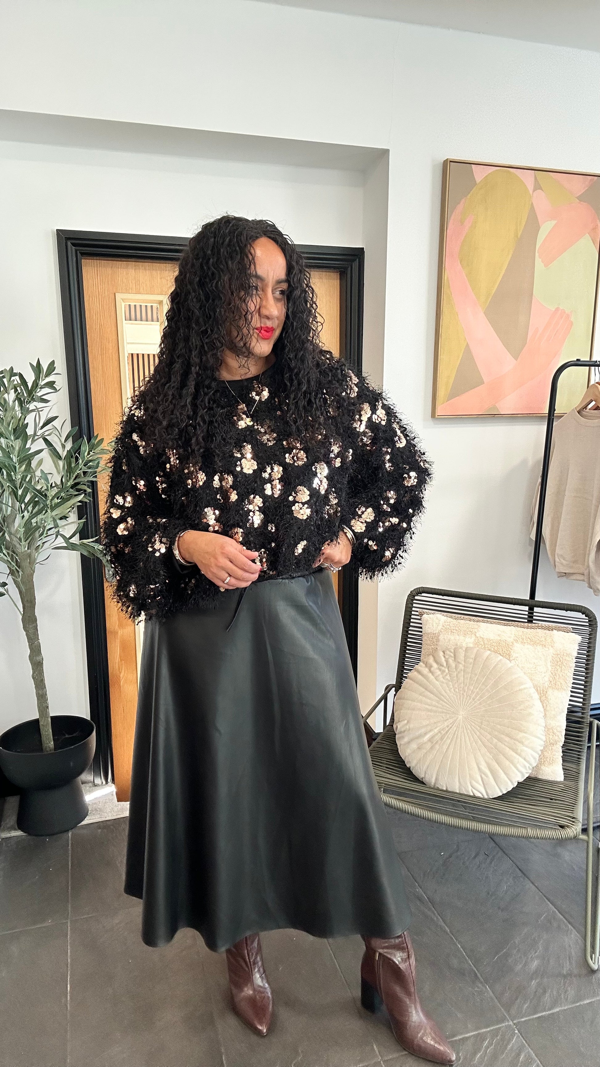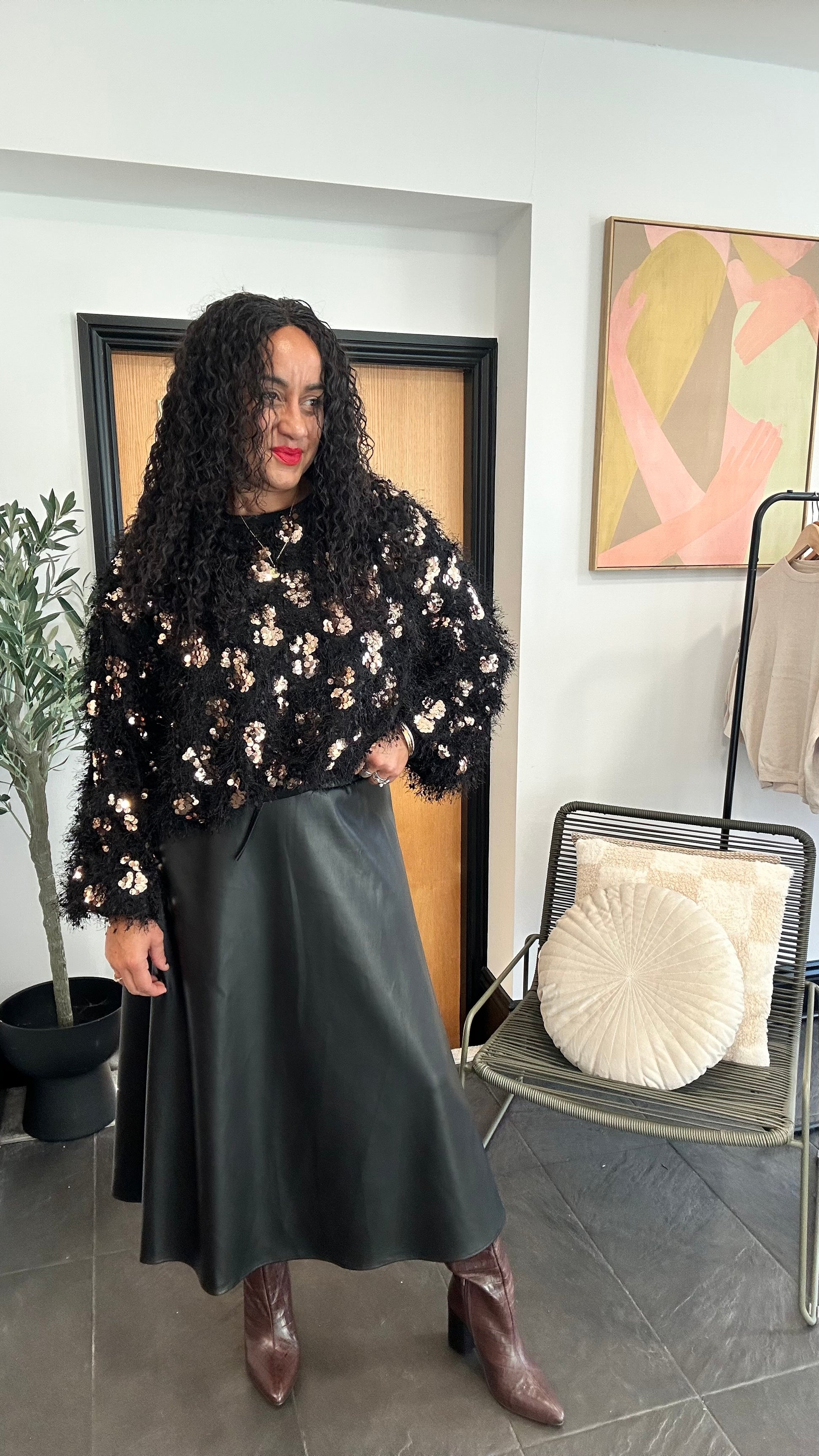 Turn heads with this glamorous black eyelash knit top, designed to bring sparkle and texture to your look. Crafted with a soft, fuzzy eyelash fabric and adorned with shimmering gold and bronze sequins, this piece perfectly balances cozy comfort and show-stopping style.