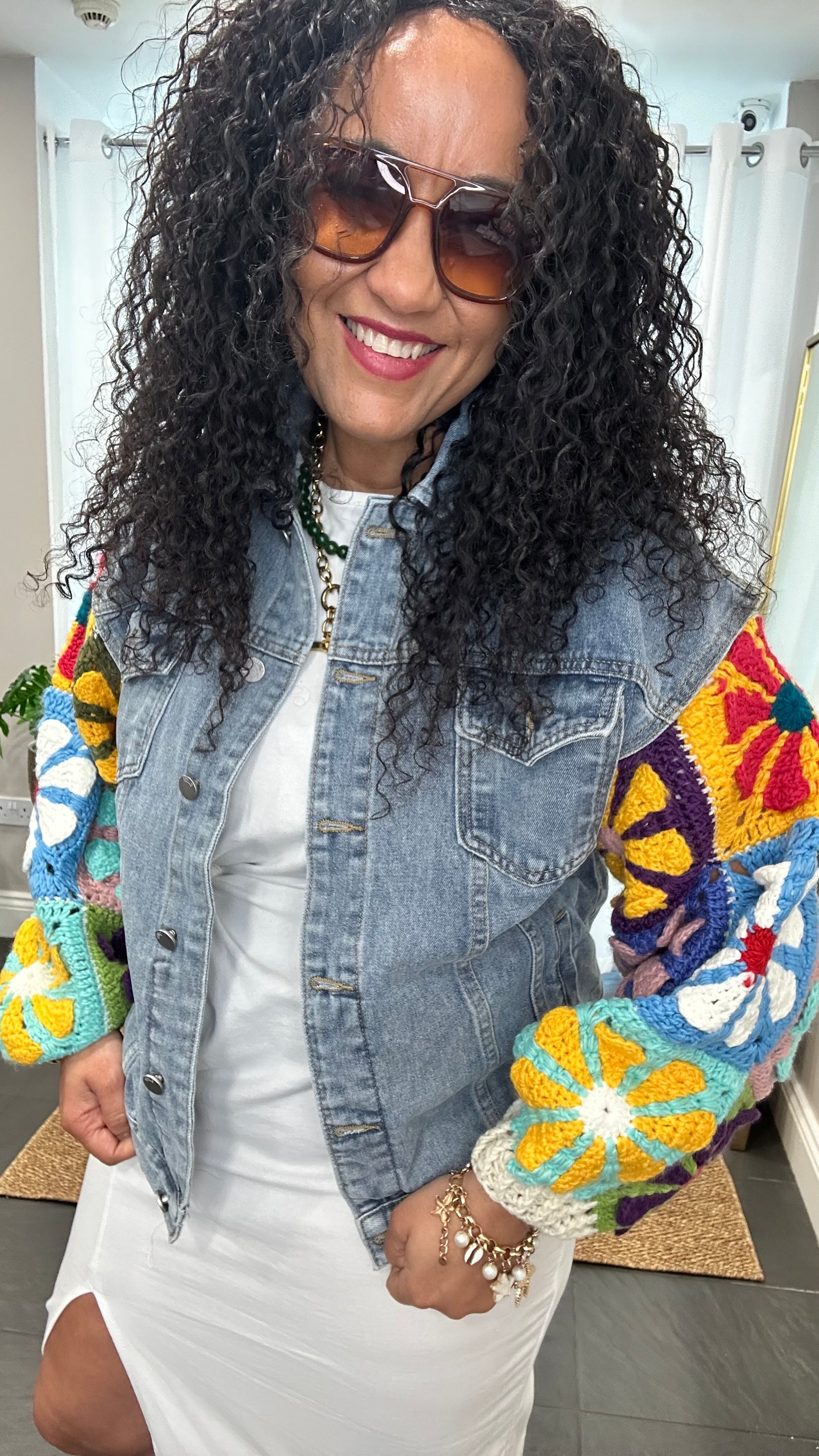 Crafted from premium distressed denim, this jacket is defined by its opulent, multicoloured crochet balloon sleeves, each thread a celebration of texture, colour, and craftsmanship.