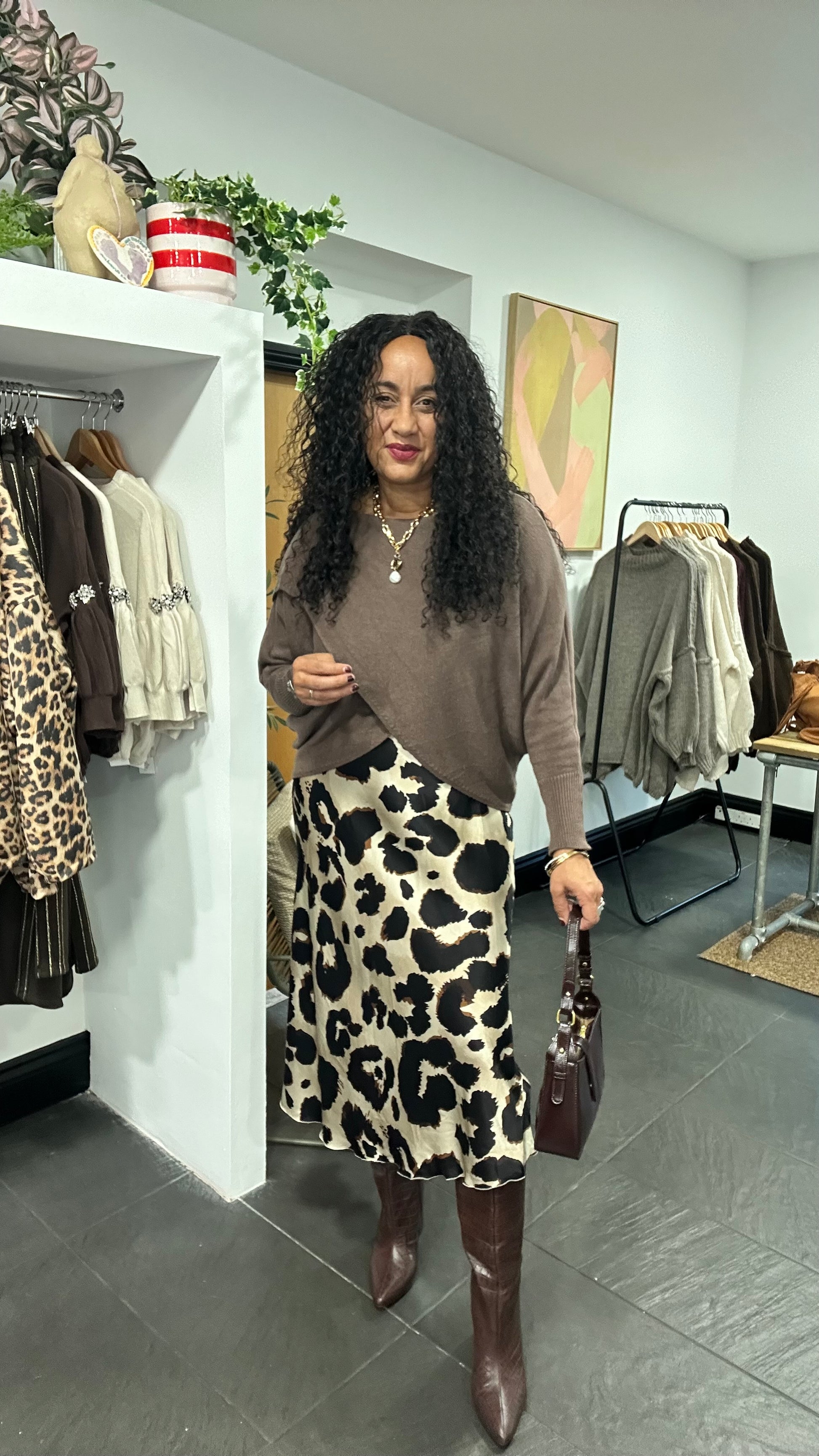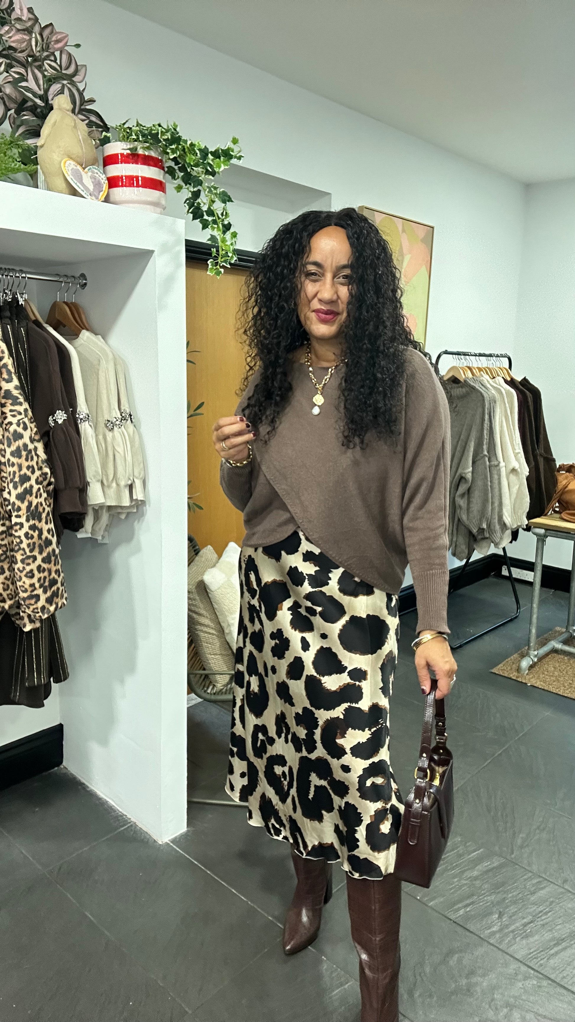 leopard print satin midi skirt, designed to bring bold style and effortless elegance to your wardrobe.