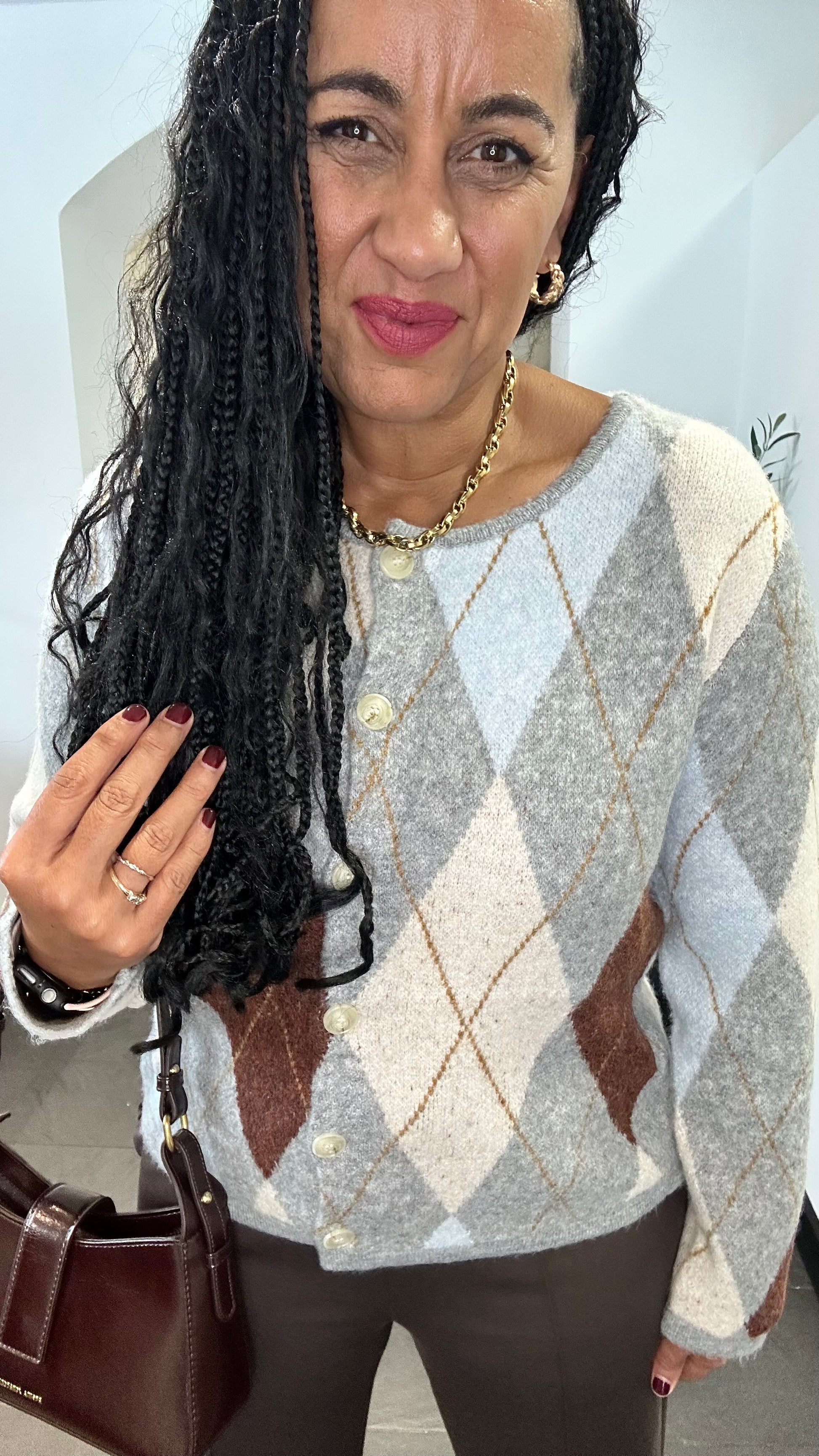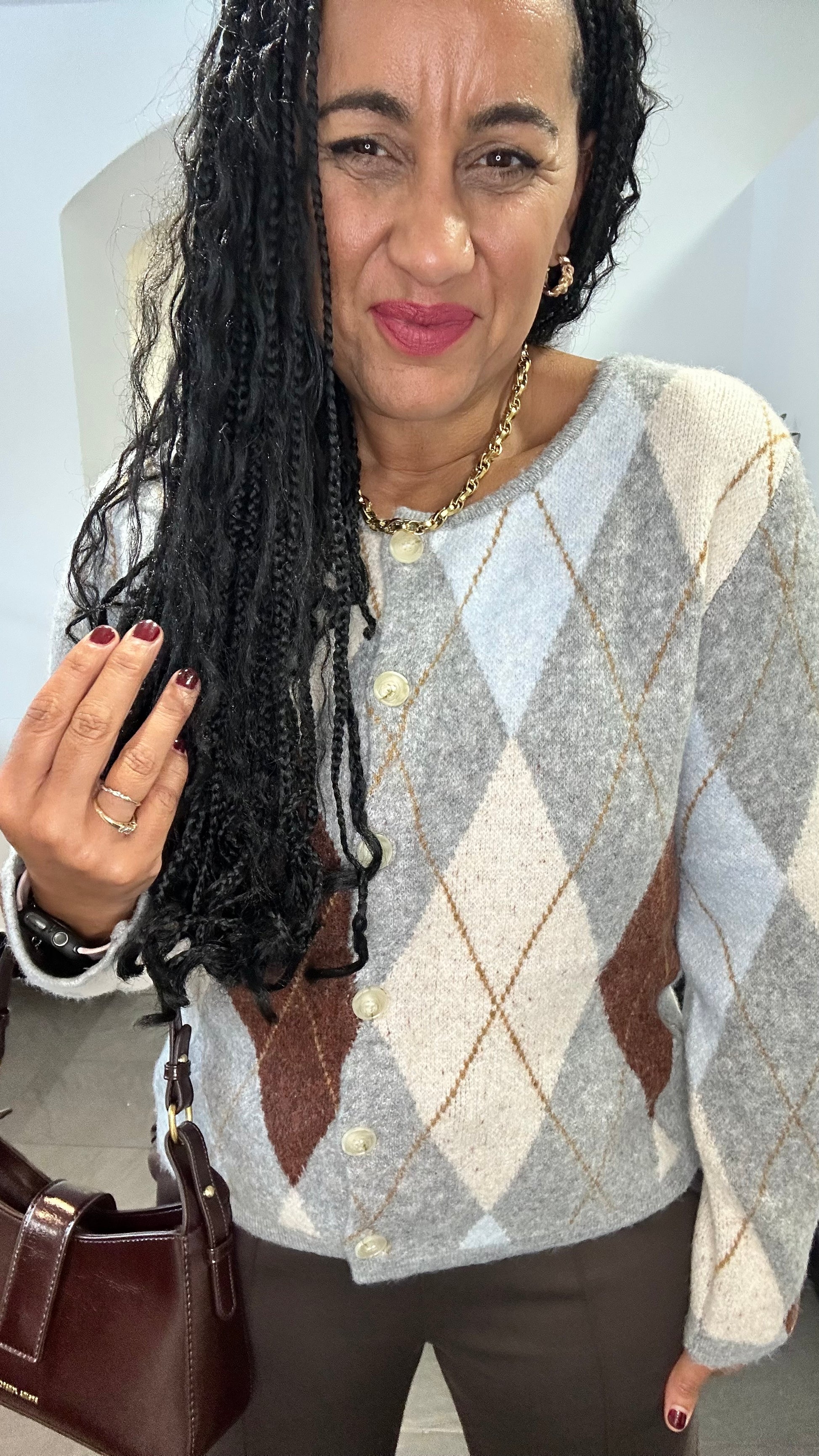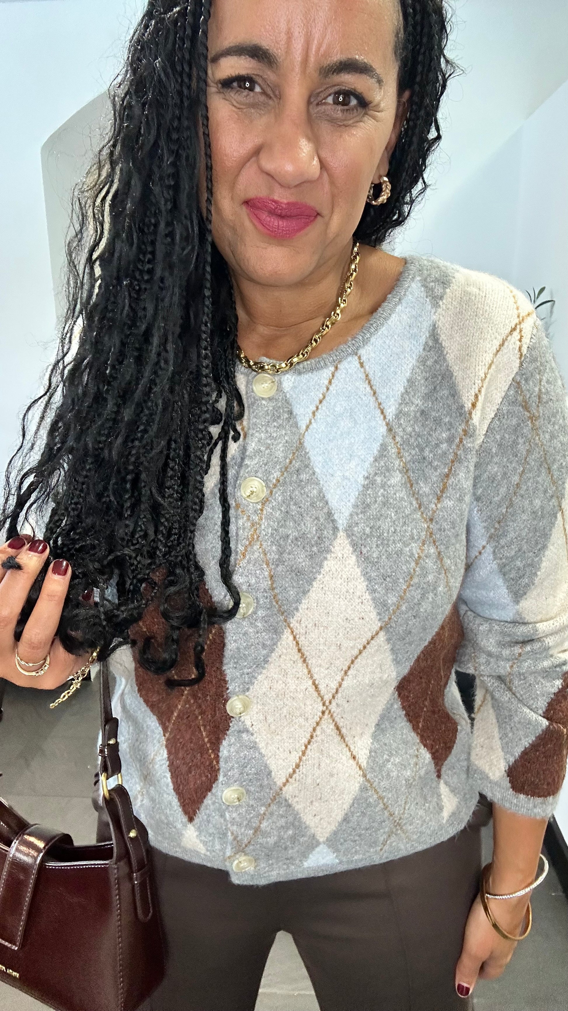 A timeless classic with a modern twist, this argyle knit cardigan is the perfect layering piece for smart-casual style. Available in three rich colour ways, each design adds a pop of vintage charm with a cozy, contemporary feel.