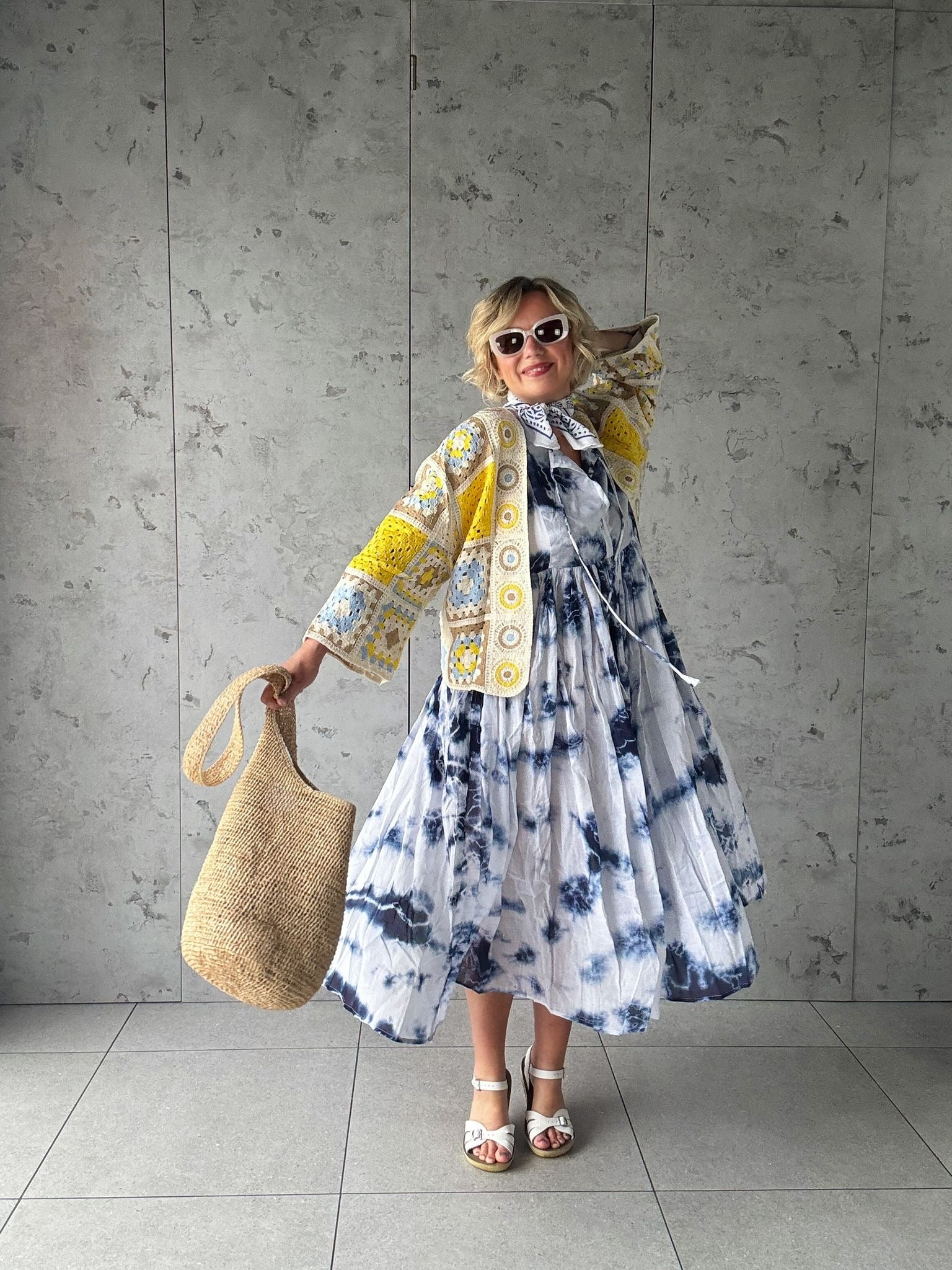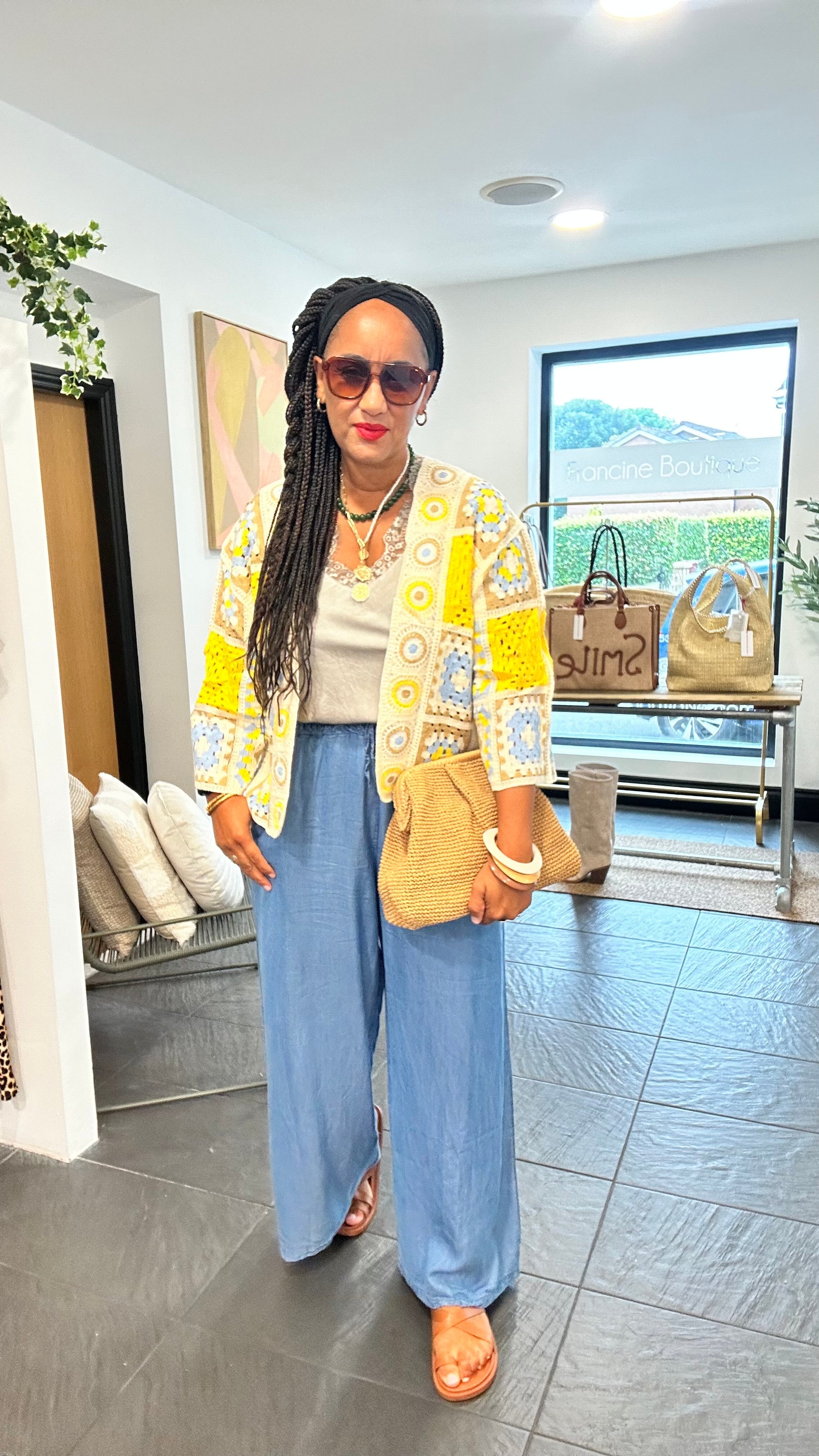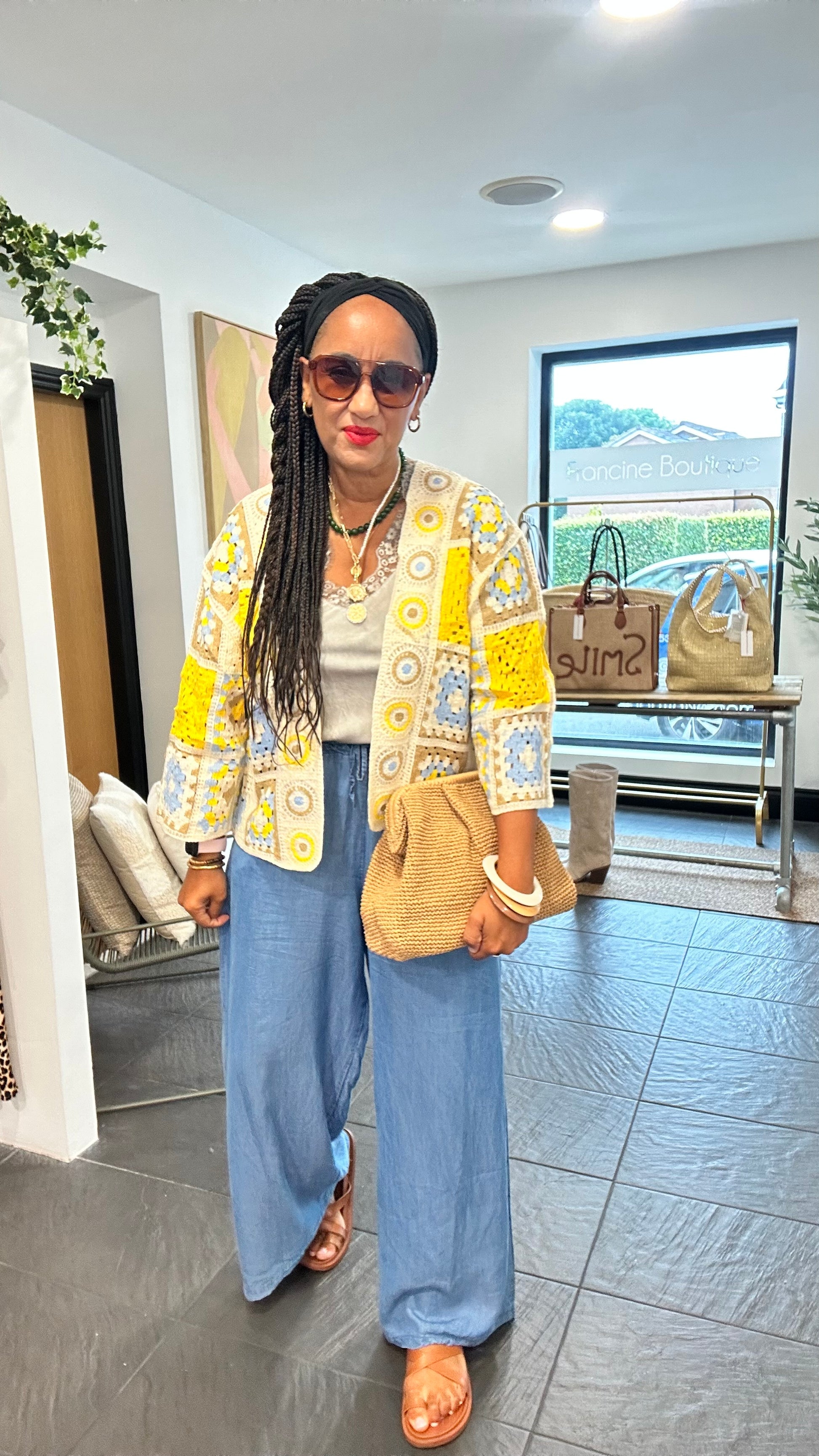 Brighten your wardrobe with our Sunshine Patchwork Crochet Jacket – a statement piece that blends boho charm with timeless craftsmanship. Crocheted in a medley of cheerful yellow, soft blue, and neutral cream tones, this jacket features a unique patchwork of granny square motifs that bring a nostalgic yet modern flair.