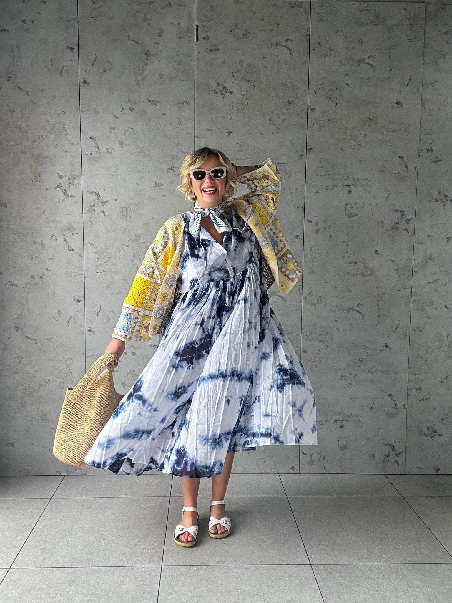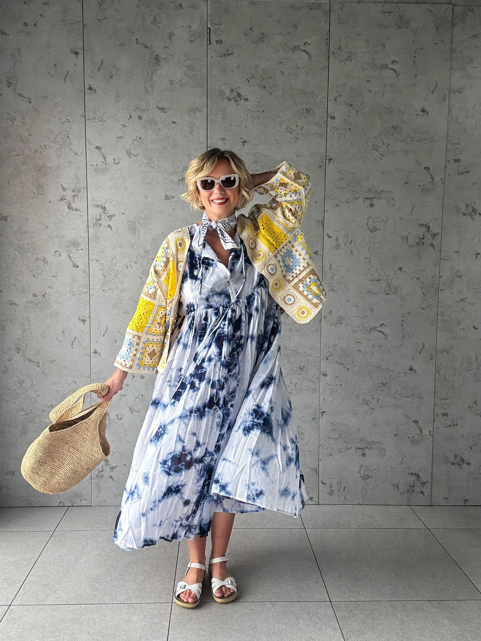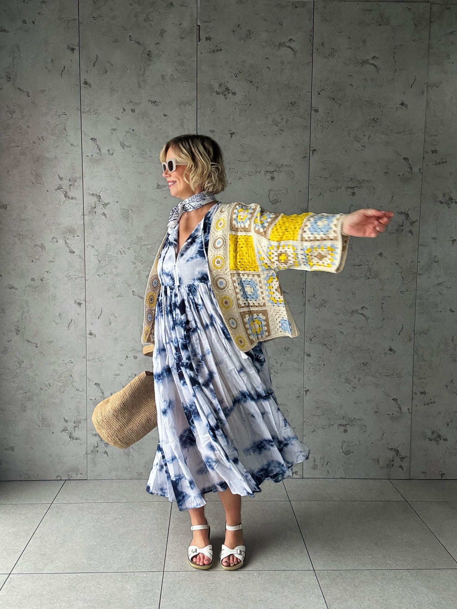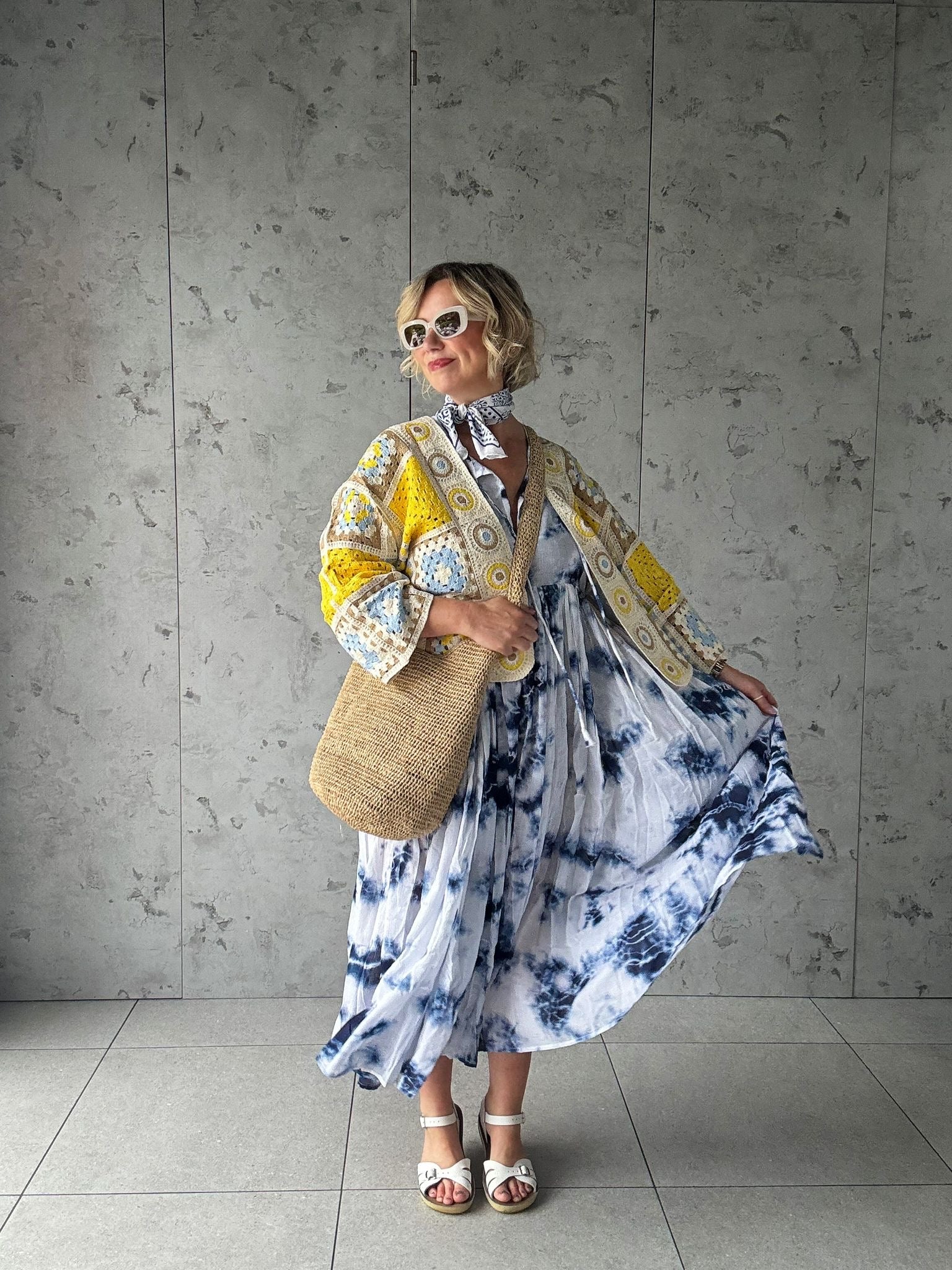 Brighten your wardrobe with our Sunshine Patchwork Crochet Jacket – a statement piece that blends boho charm with timeless craftsmanship. Crocheted in a medley of cheerful yellow, soft blue, and neutral cream tones, this jacket features a unique patchwork of granny square motifs that bring a nostalgic yet modern flair.