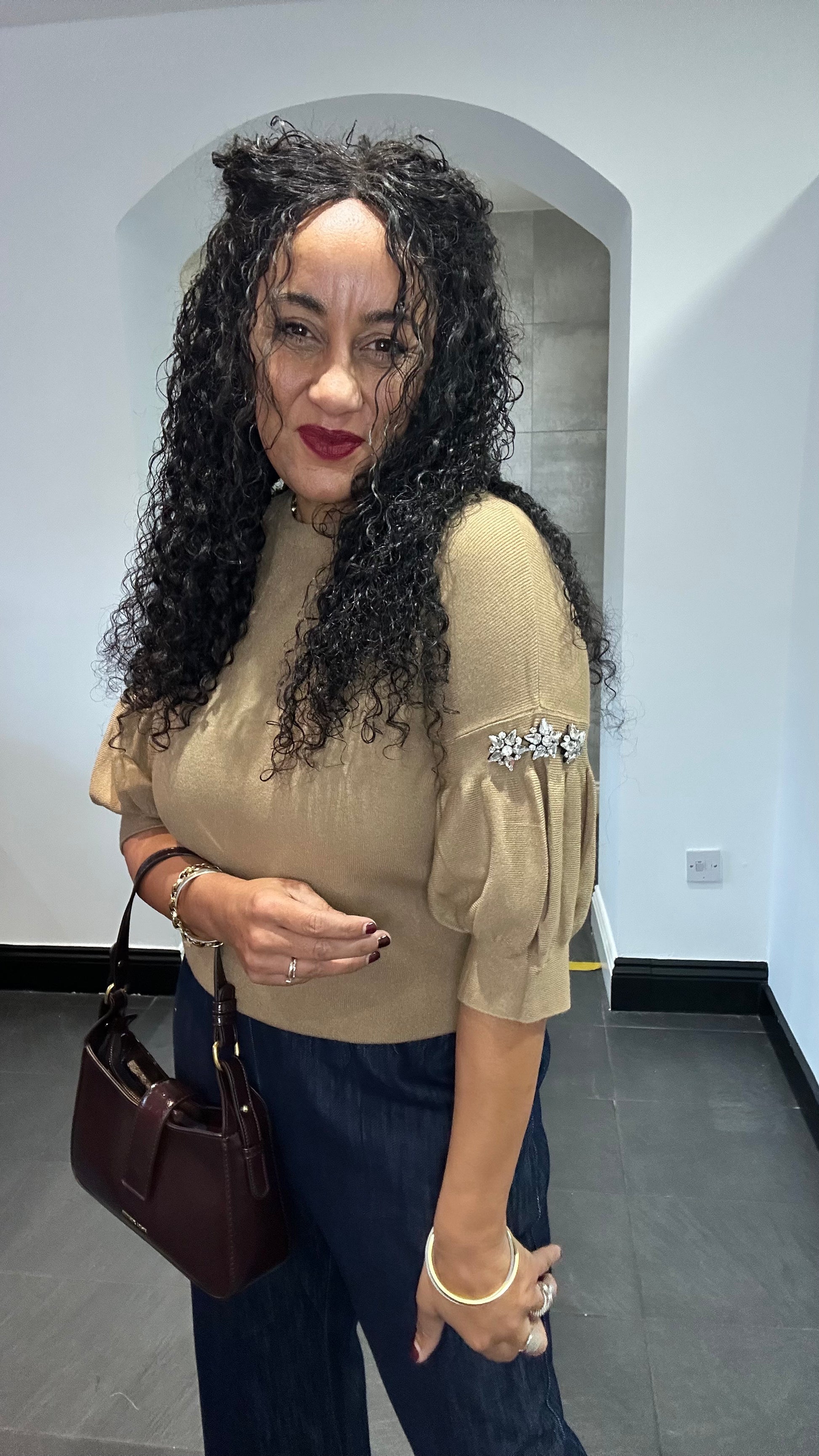 - Design: A chic knit top with statement puff sleeves, finished with sparkling jewel embellishments for a touch of glamour.