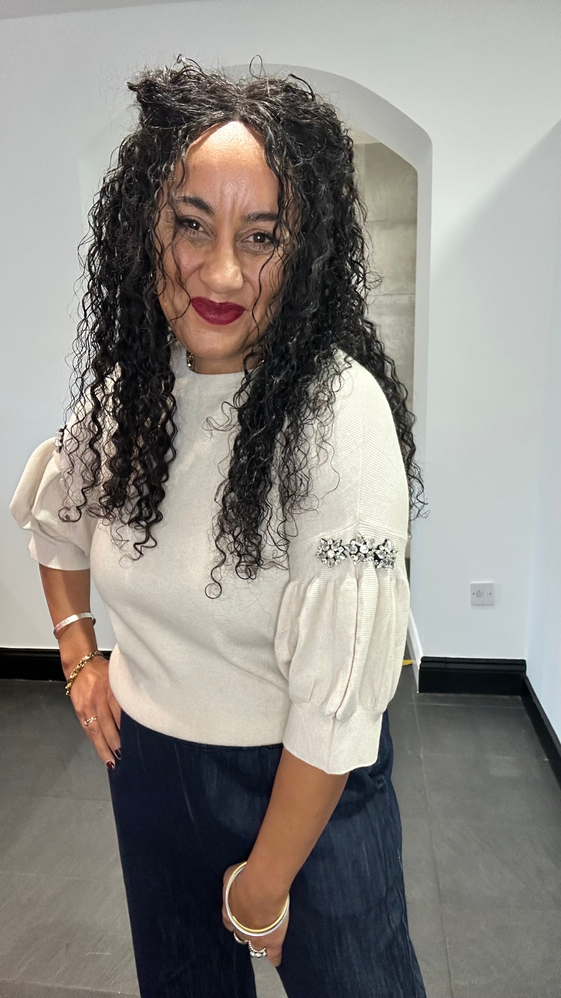 - Design: A chic knit top with statement puff sleeves, finished with sparkling jewel embellishments for a touch of glamour.