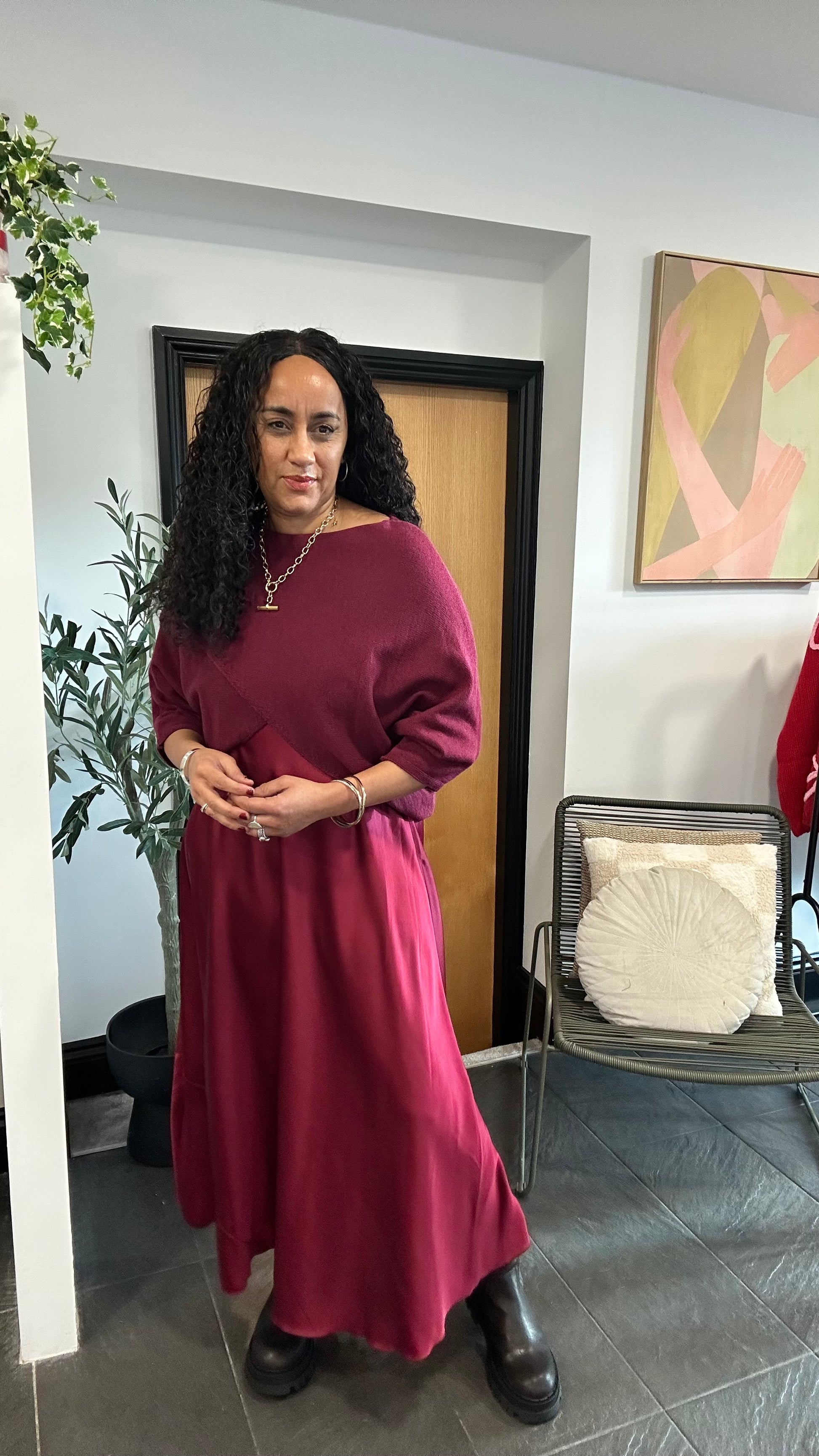 MABLE OPEN KNIT AND SATIN MAXI DRESS BURGUNDY *New
