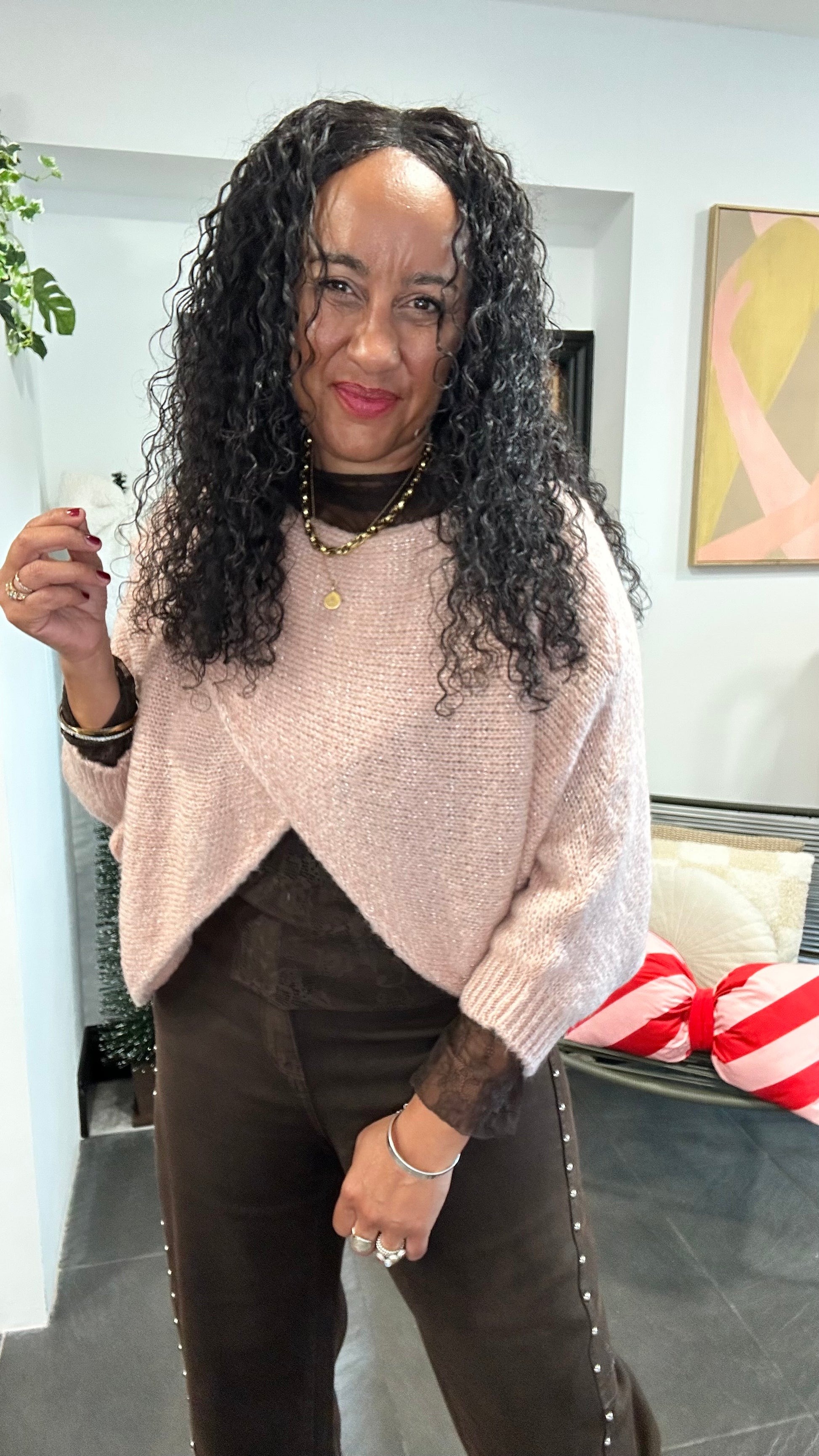 Such a beautifully textured cocoon knit, woven with delicate silver lurex thread for a subtle shimmer. Designed for versatility, this clever piece can be worn two ways, with the crossover detail in the front for a sculpted, contemporary silhouette, or reversed with the crossover at the back for a relaxed, draped look.
