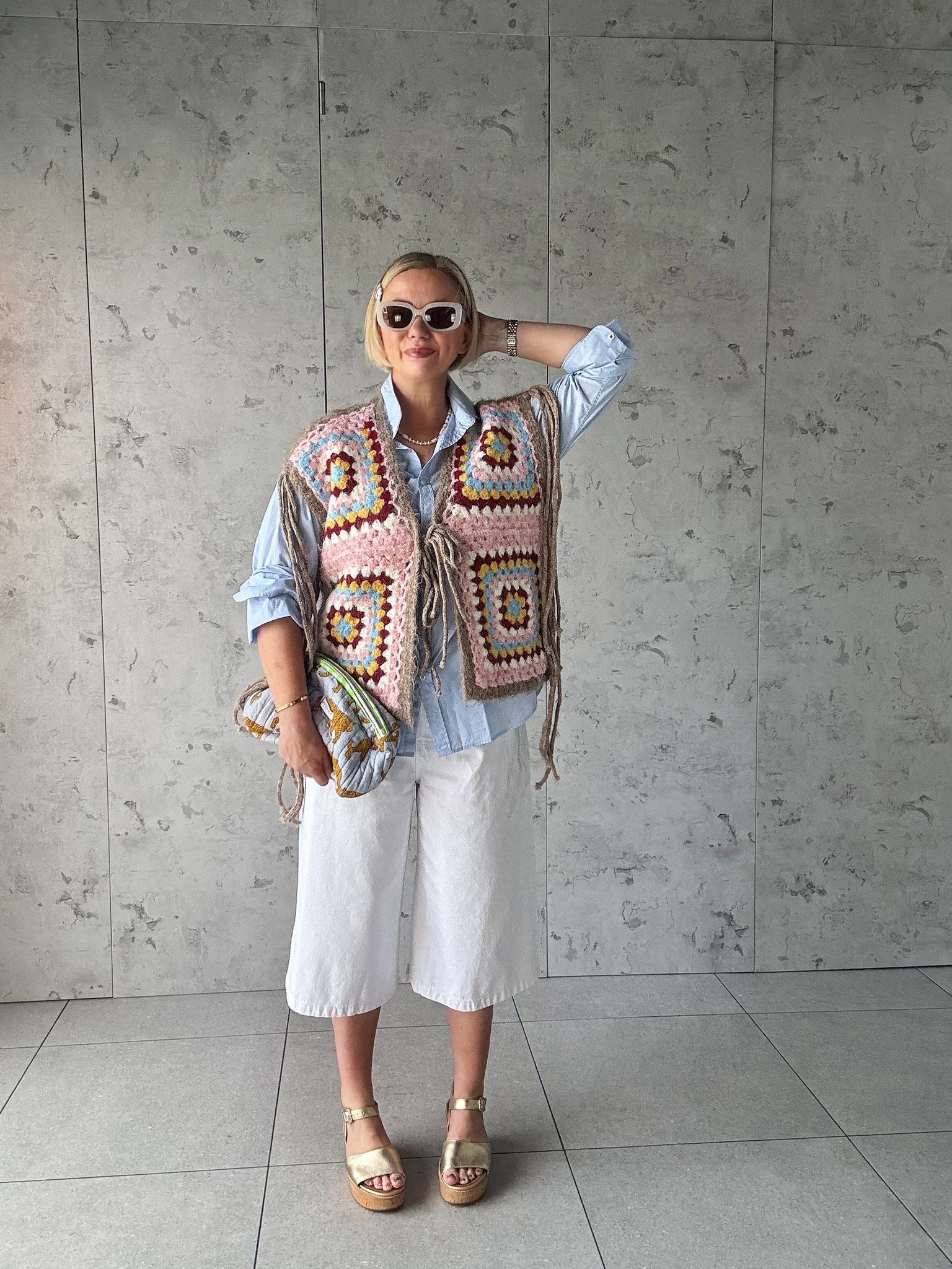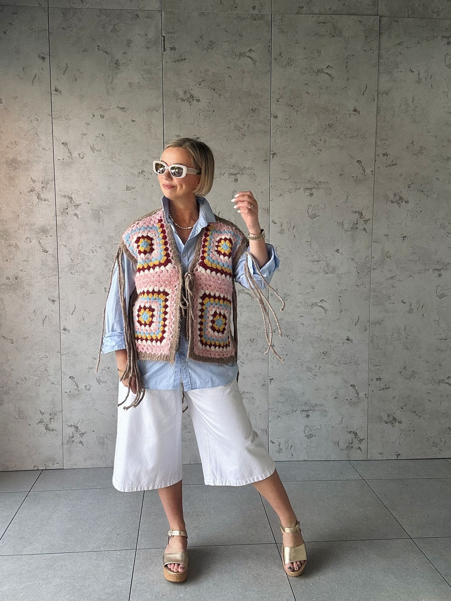 Add a touch of vintage-inspired flair to your wardrobe with this oversized crochet-effect Waistcoat.