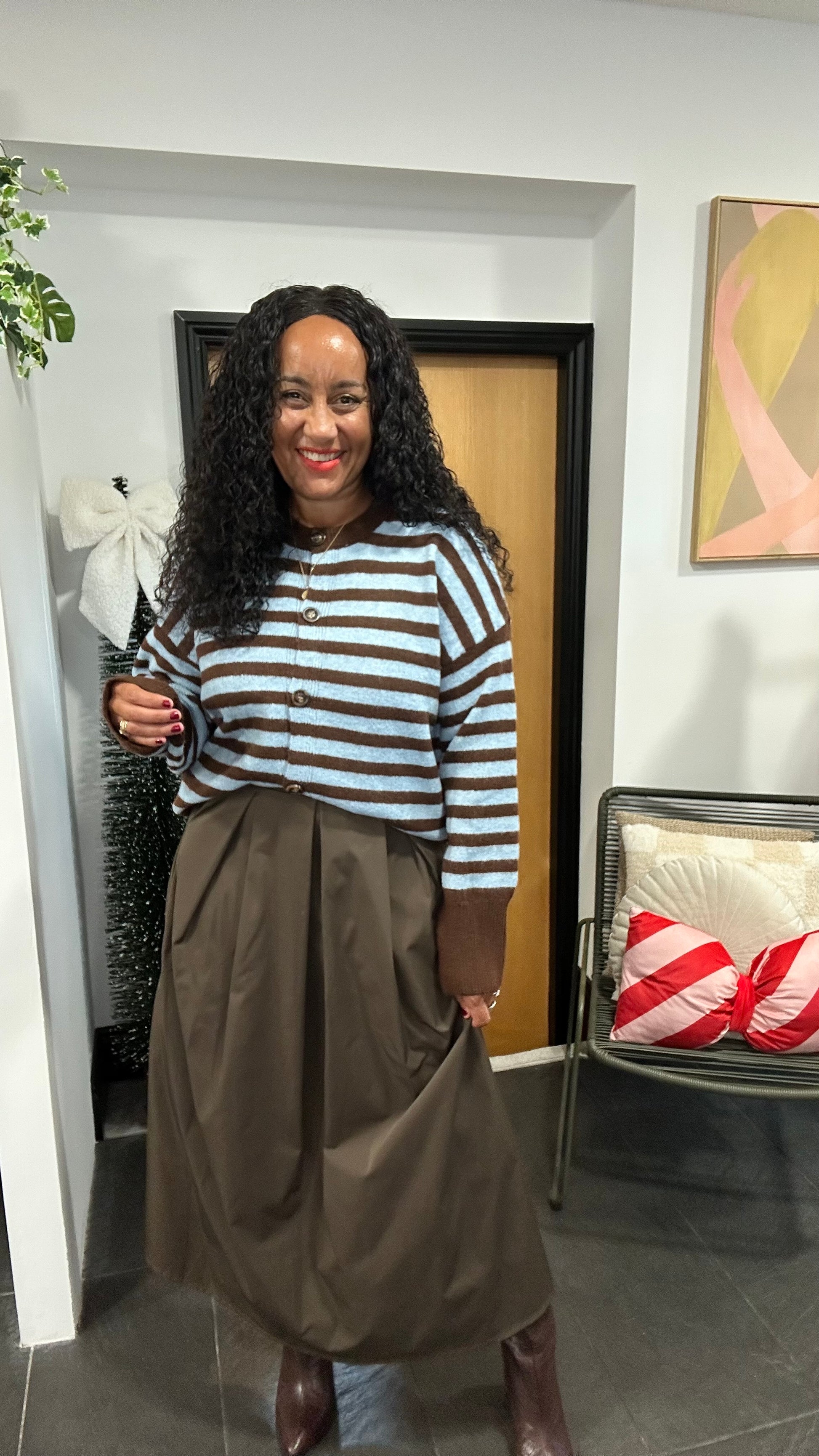 The Chocolate & Powder blue Striped Knit Cardigan / Sweater brings cozy comfort and modern style together in one easy piece. Featuring bold chocolate brown and powder pink stripes, this sweater offers a fresh take on a classic pattern.