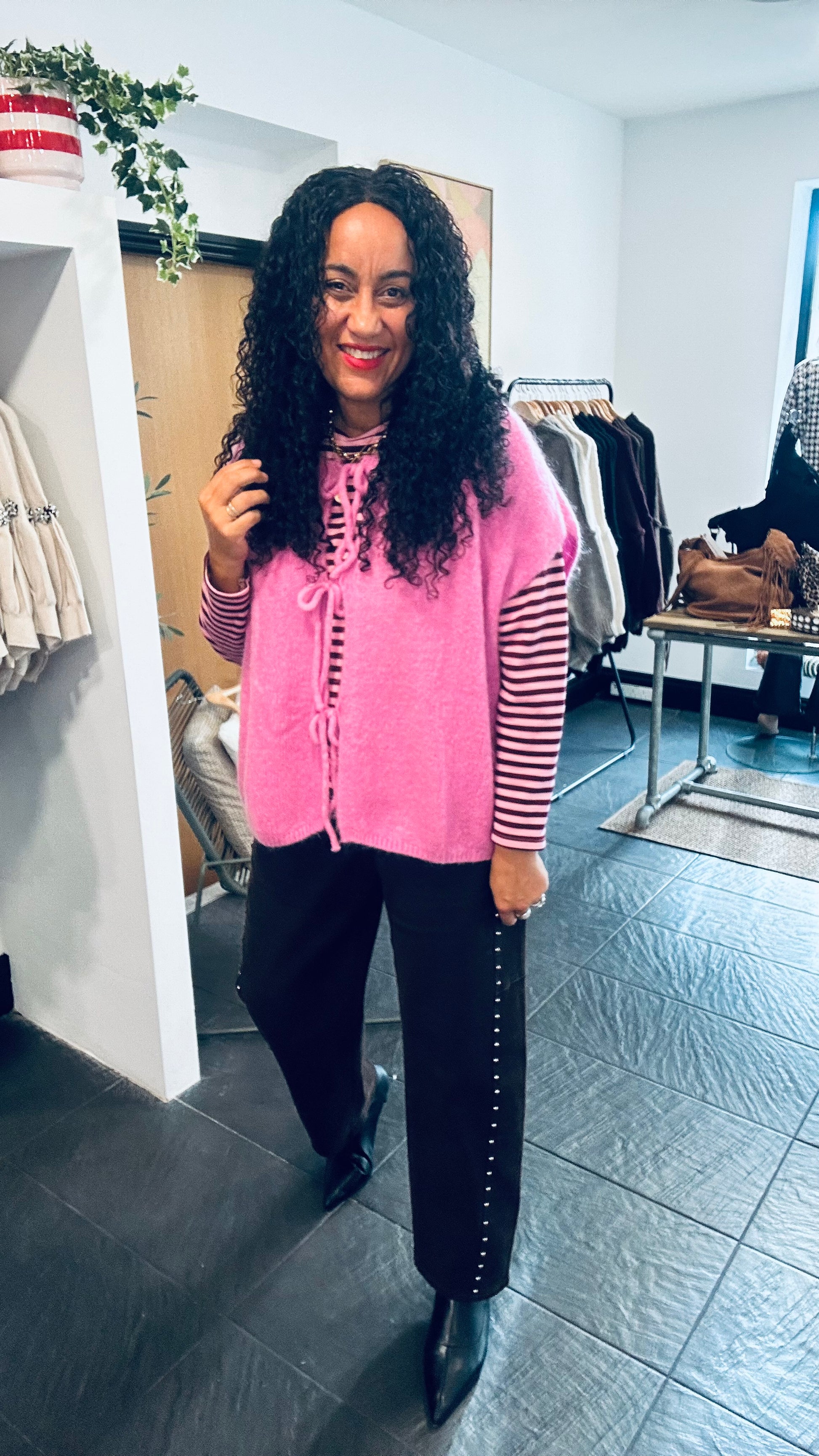This drop-shoulder, button-through sleeveless cardigan (or waistcoat) blends a boxy silhouette with a relaxed, modern edge.