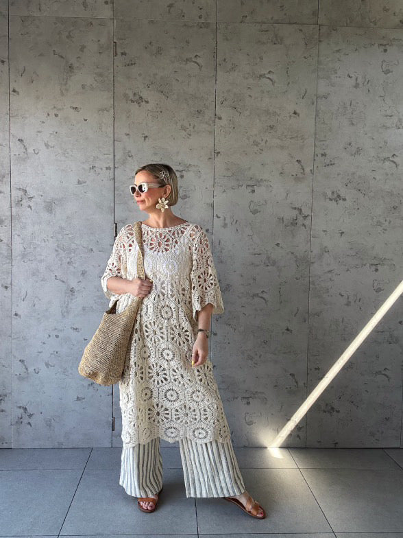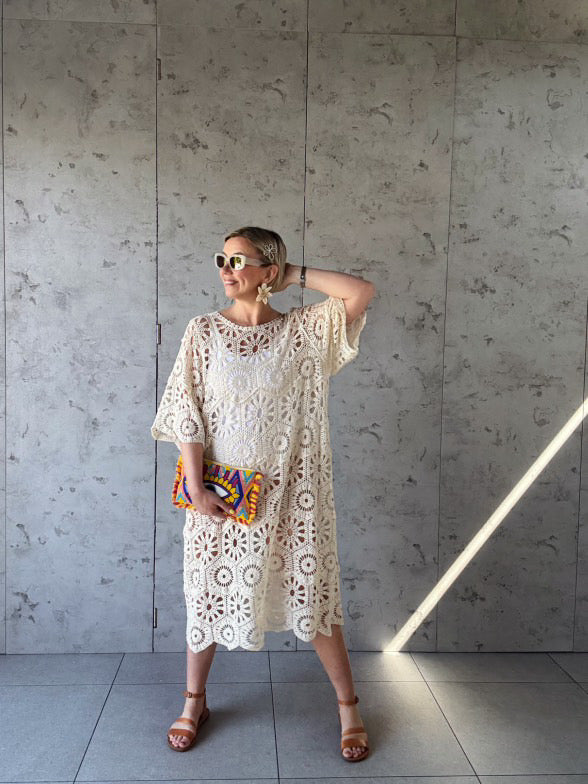 Chic, effortless, and endlessly versatile, this 3/4 sleeve crochet dress is a must-have for any wardrobe. Featuring a classic round neckline and intricate open-knit design, it offers a perfect balance of elegance and ease. The breathable crochet fabric and stylish 3/4 sleeves make it ideal for layering—wear it over a vest and trousers for a relaxed yet polished look, pair it with a slip dress for evening sophistication, or style it as a breezy swimwear cover-up. A timeless staple for any season.