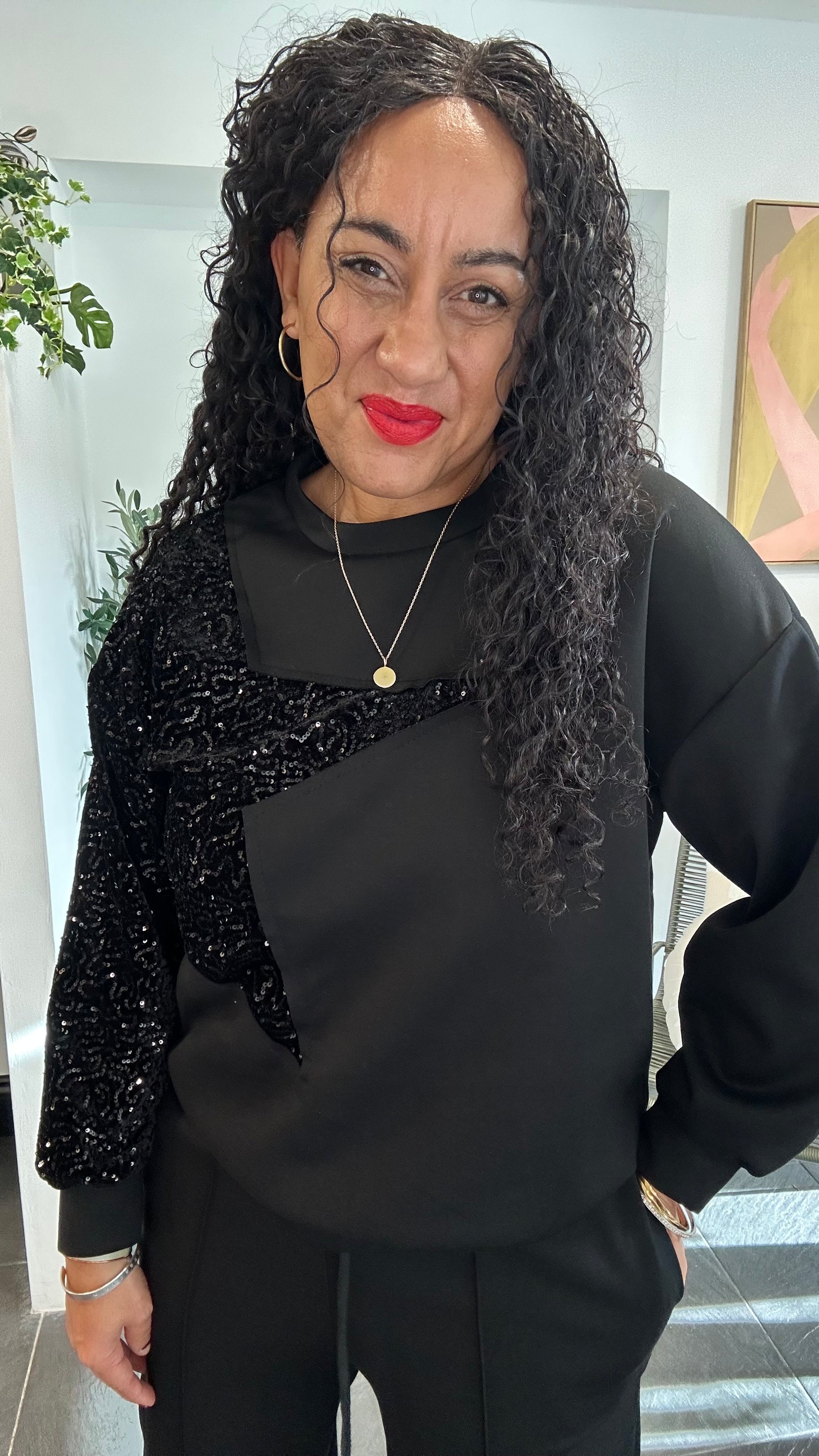 Soft sweatshirt set with a statement sequin star panel across the front and matching sequin sleeves. Comes with coordinating wide-leg trousers in the same fabric for a pulled-together look with comfort. Ribbed finishes at the neckline, cuffs and hem give light structure.