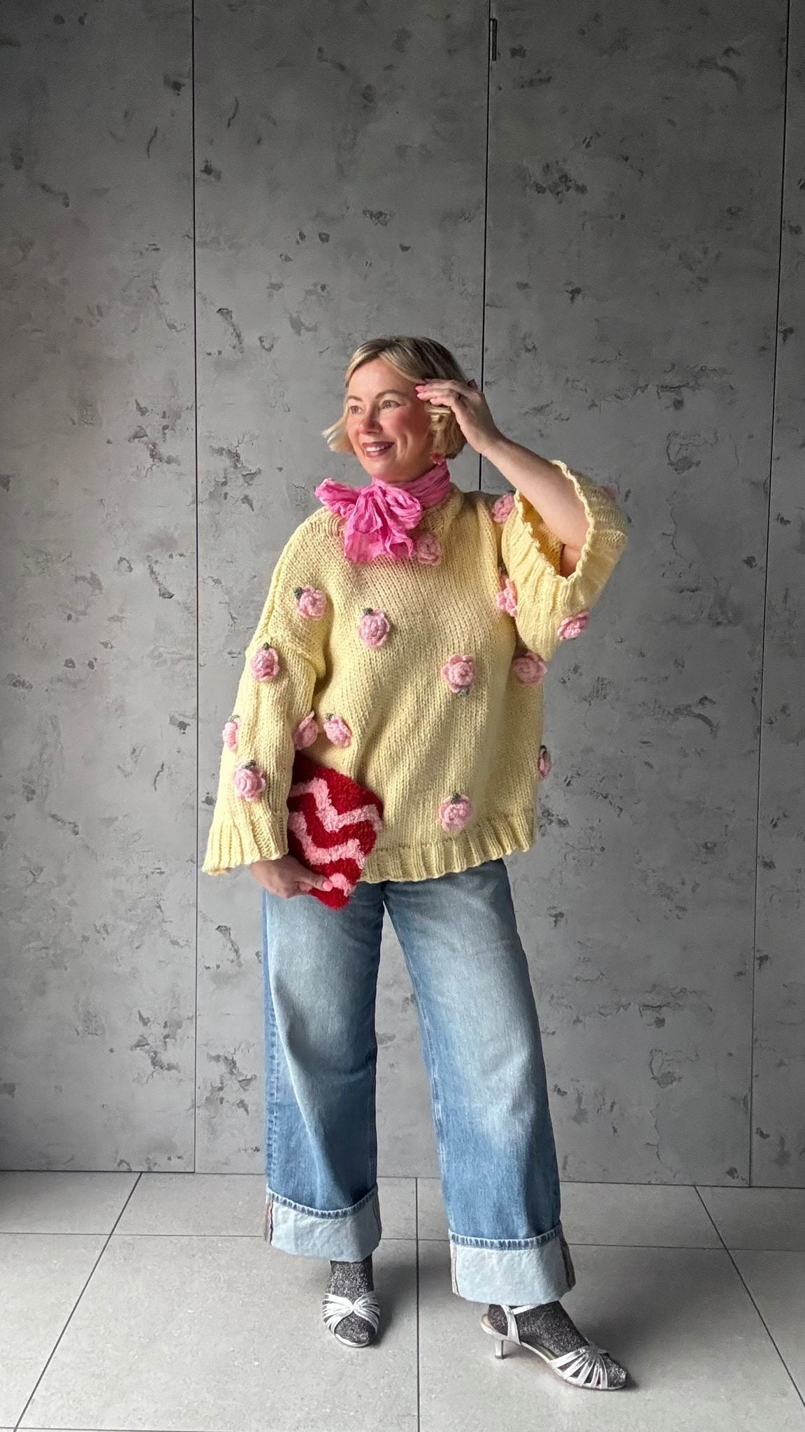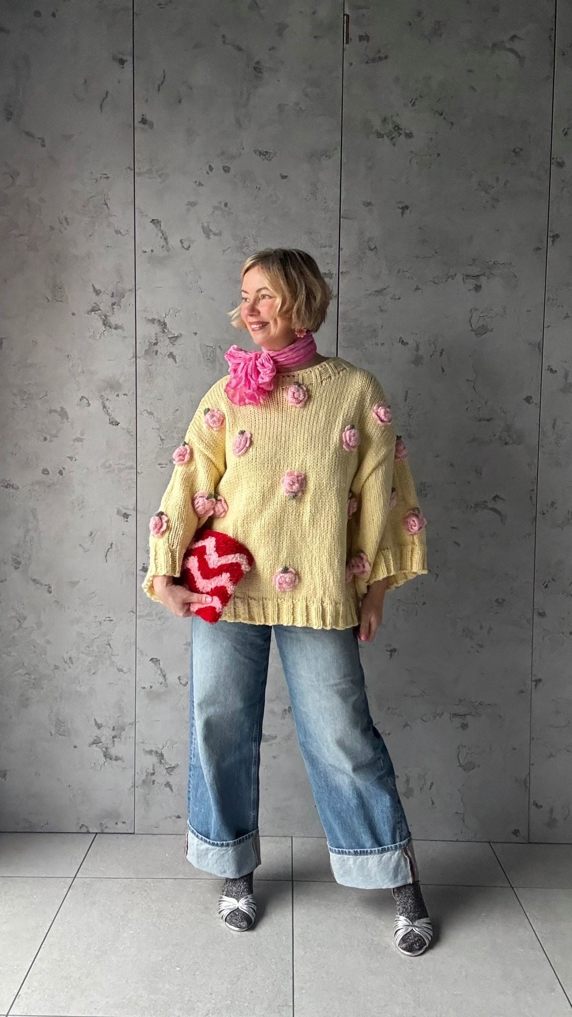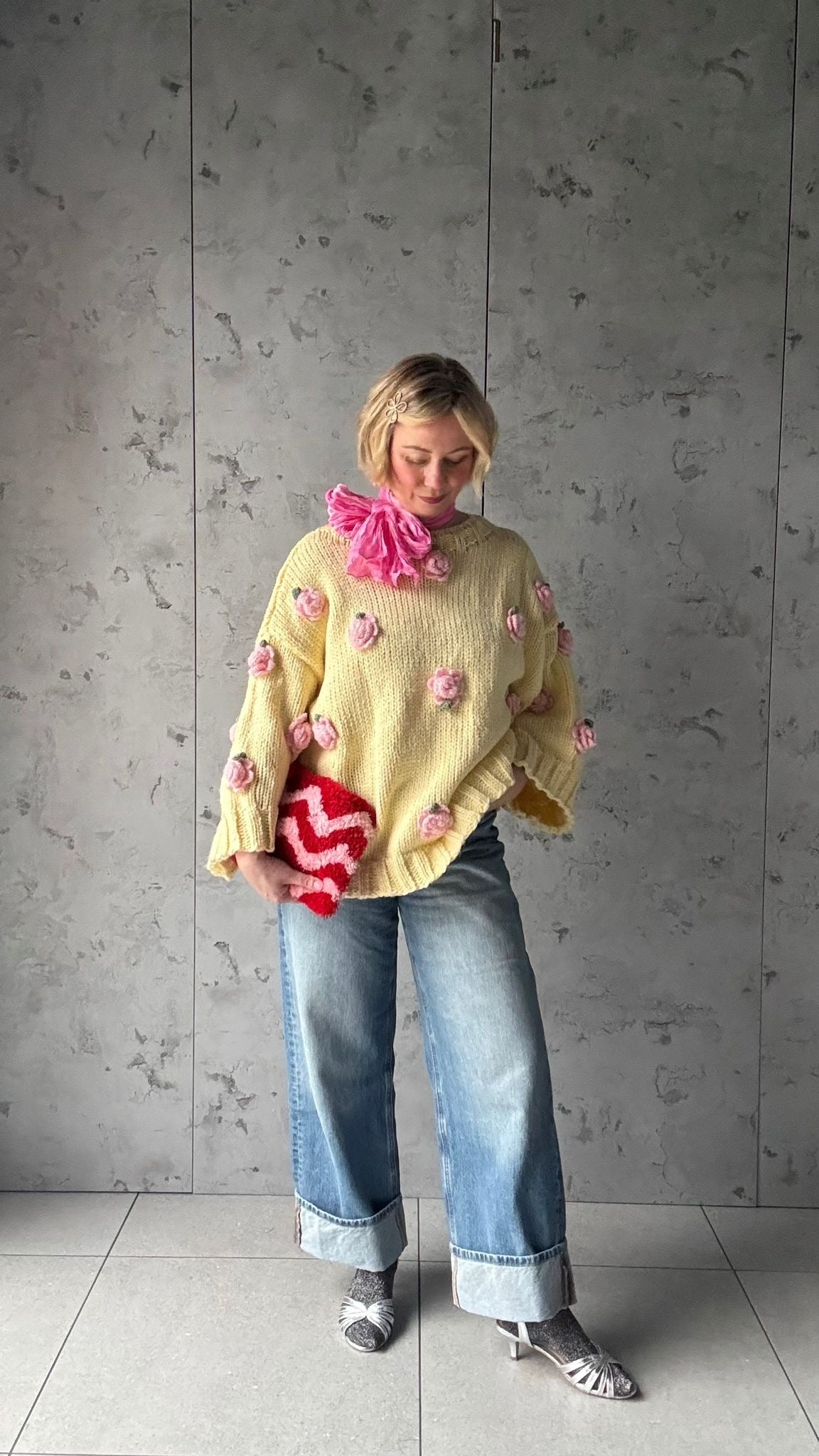 Add a touch of charm to your wardrobe with this handmade pastel yellow knit jumper, thoughtfully crafted for a cozy yet statement look. Made from a soft, chunky yarn, this piece features delicate hand-crocheted pink floral appliqués evenly placed across the body and sleeves, giving it a whimsical, artisanal feel.