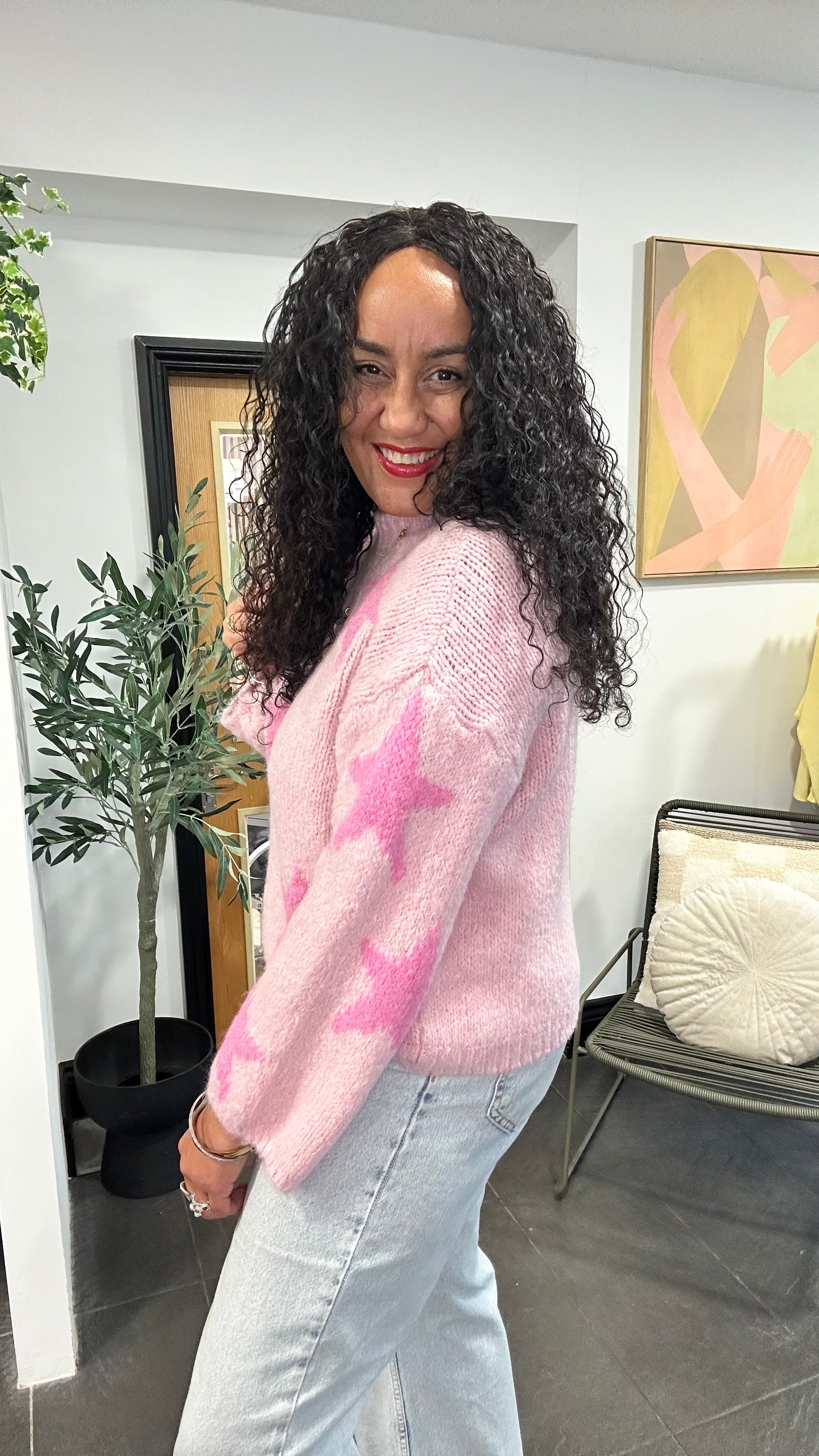 Add a soft pop of colour to your everyday wardrobe with this dreamy blush-pink star knit jumper. Featuring fluffy hot pink stars scattered across a pale pink base, this cosy piece is equal parts playful and feminine, perfect for brightening up grey days.