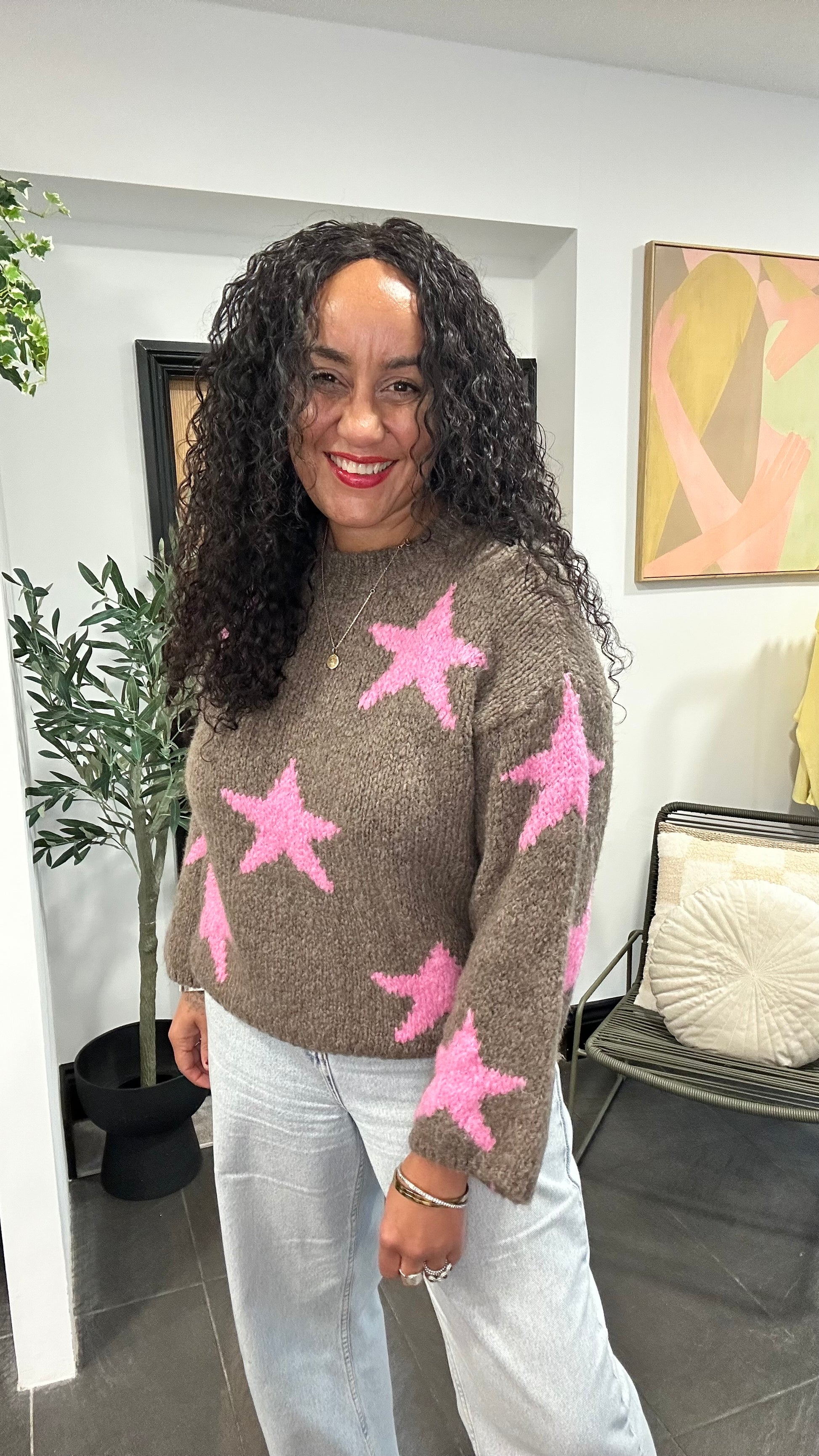 Turn everyday comfort into a statement ✨ This irresistibly soft knit jumper features bold bubble gum pink stars scattered across a rich chocolate-brown base, creating the perfect mix of playful and chic. Designed with a relaxed silhouette and cozy long sleeves, it’s the piece you’ll reach for when you want to feel comfy but still look put-together.