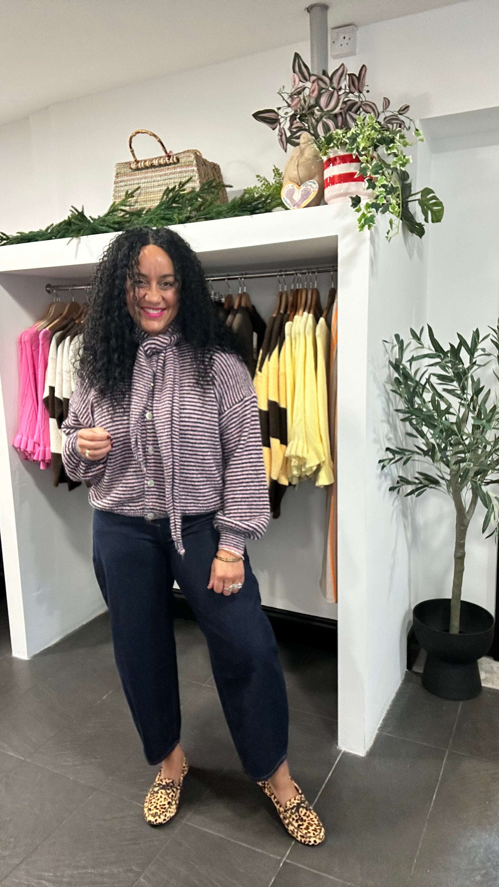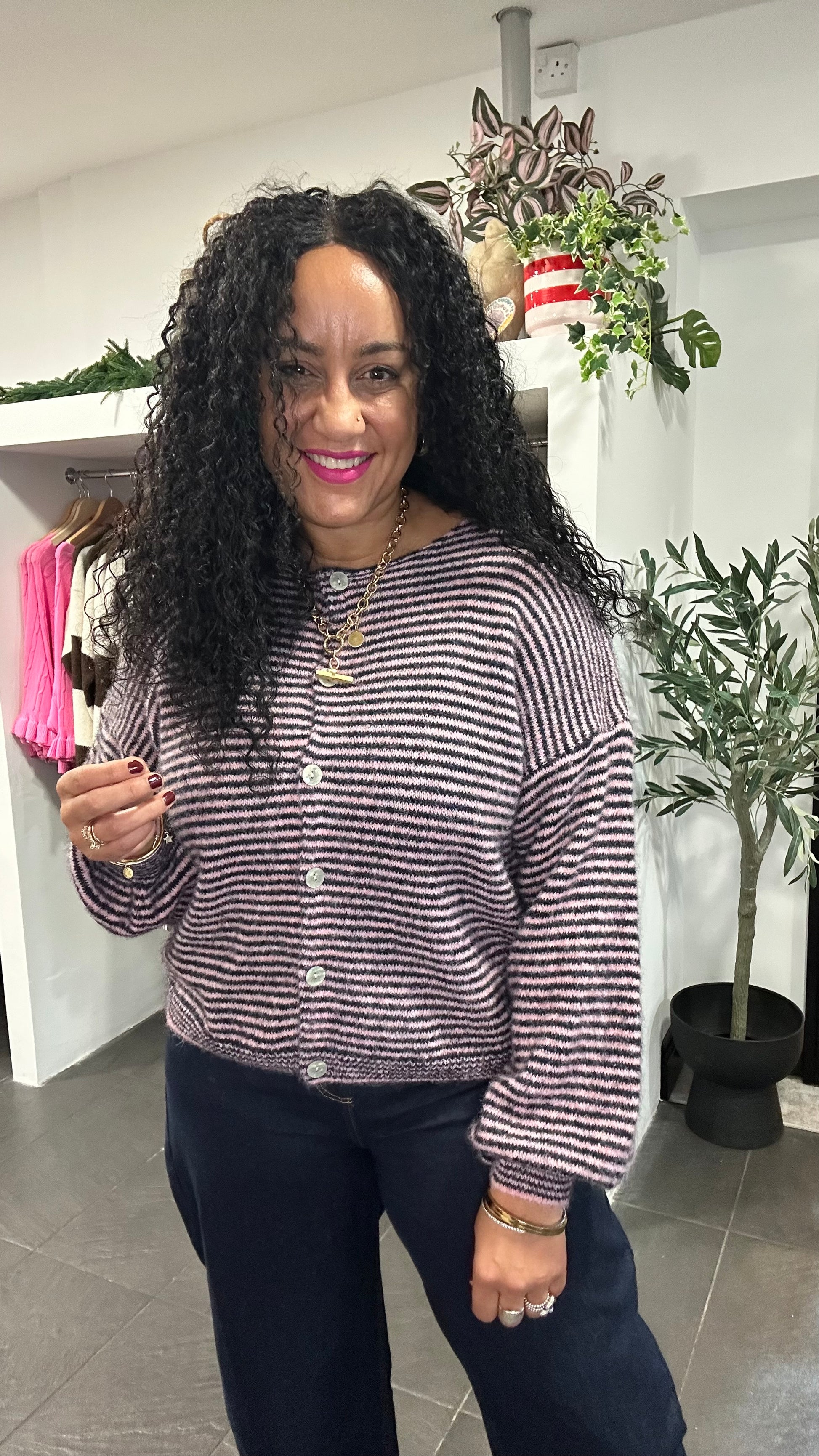 RACHEAL STRIPE KNIT BUTTON CARDIGAN WITH SCARF PURPLE *New
