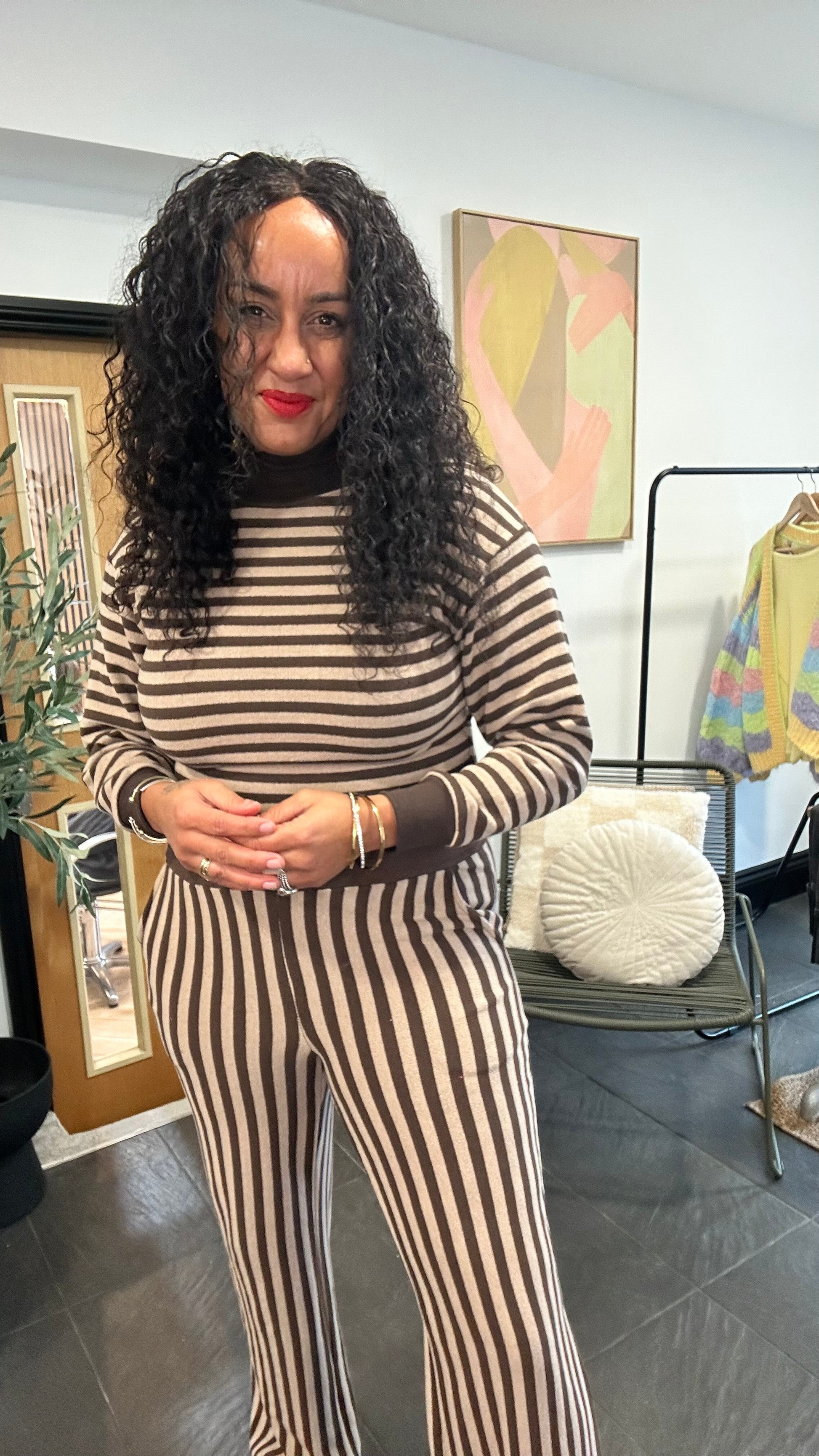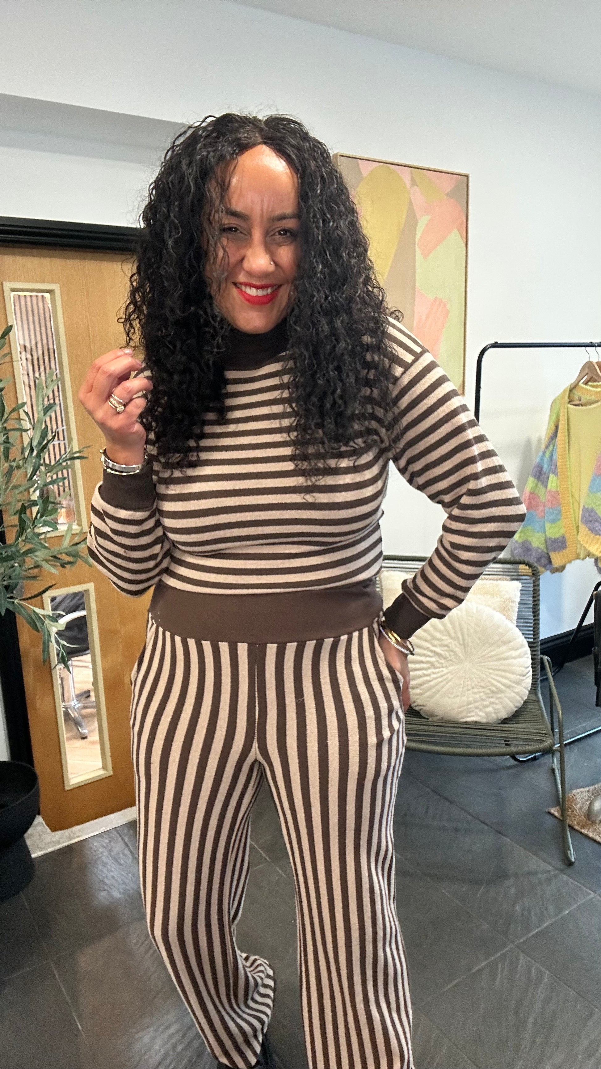 This brown and cream striped top features a soft ribbed knit texture with a cozy mock neckline and relaxed long sleeves. Designed with a slightly boxy fit, it delivers comfort while maintaining a stylish, modern silhouette. The length makes it perfect for layering or wearing solo for a laid-back, chic look.