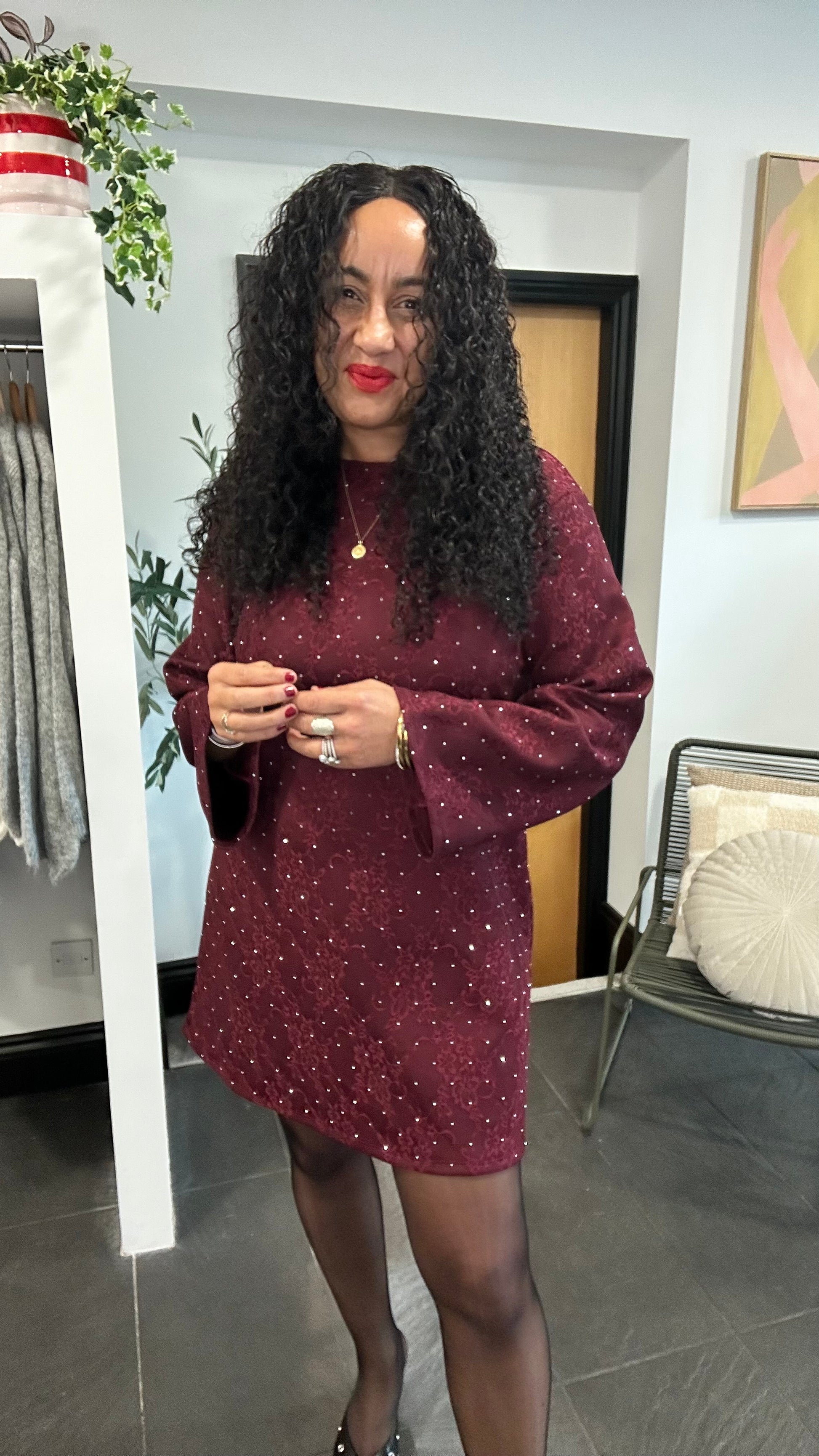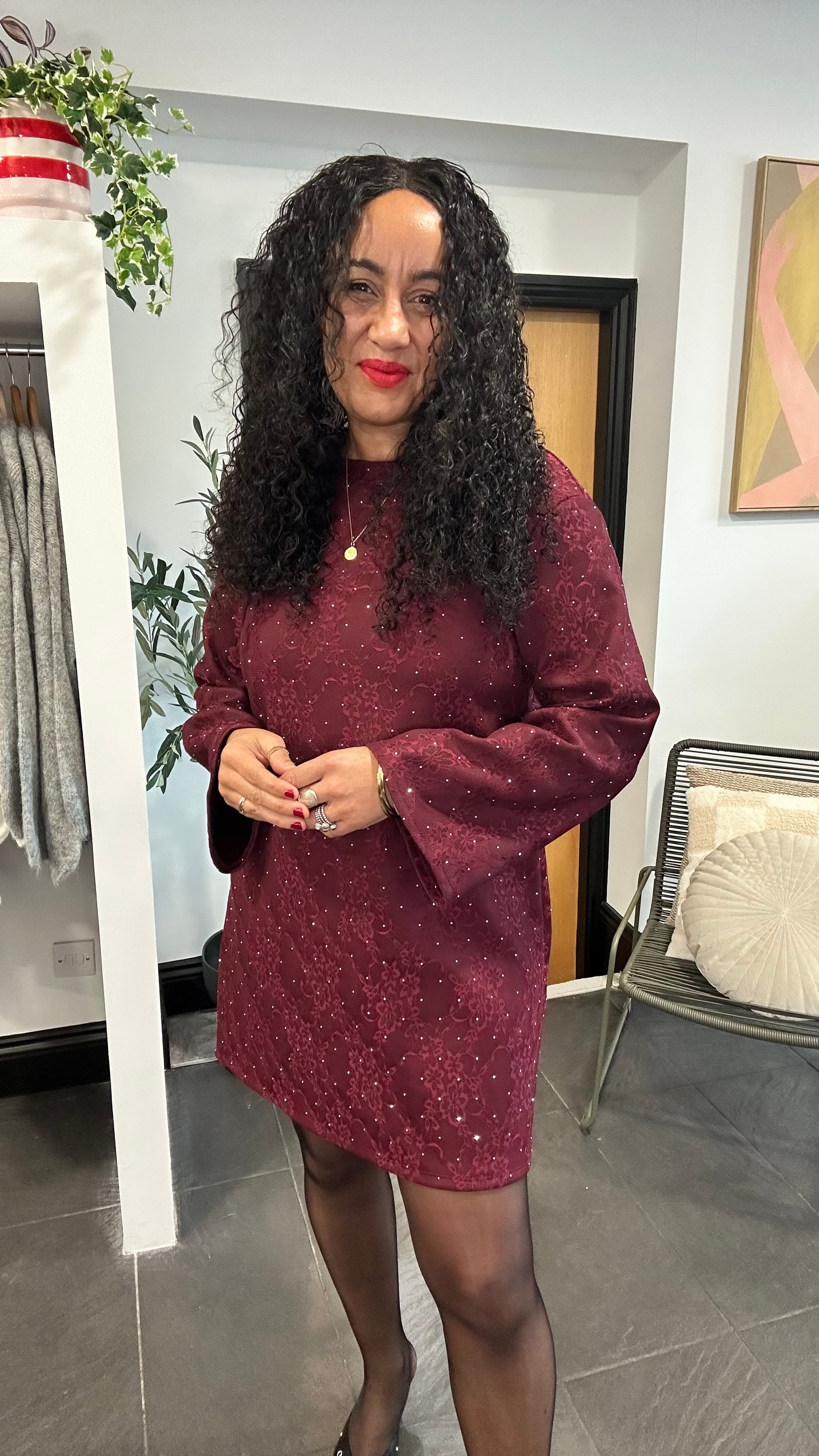 TERESA STUD DETAIL JACQUARD BOW BACK DRESS BURGUNDY WINE *NEW