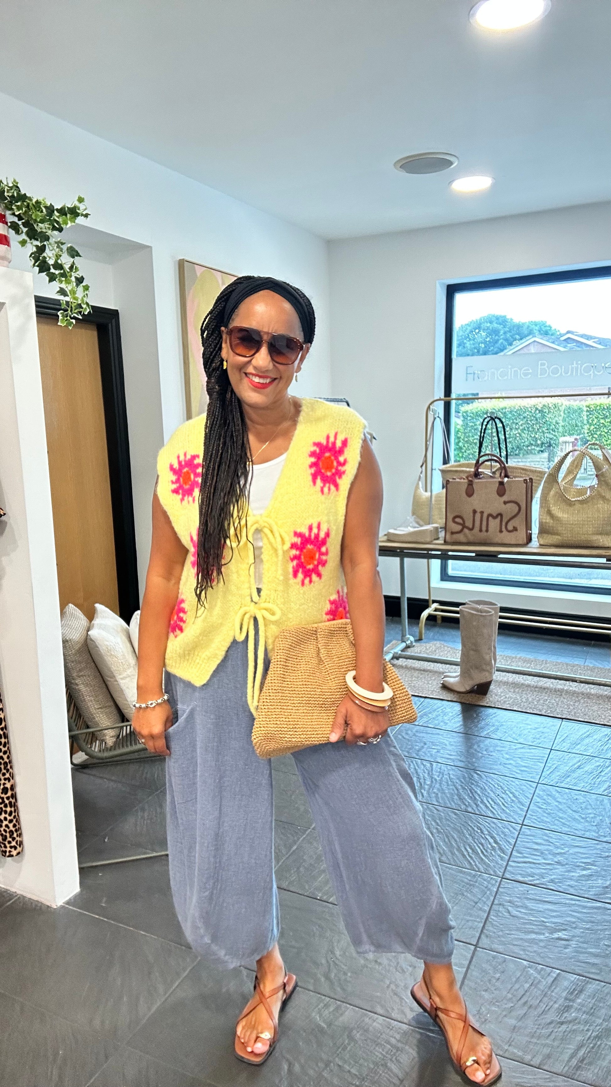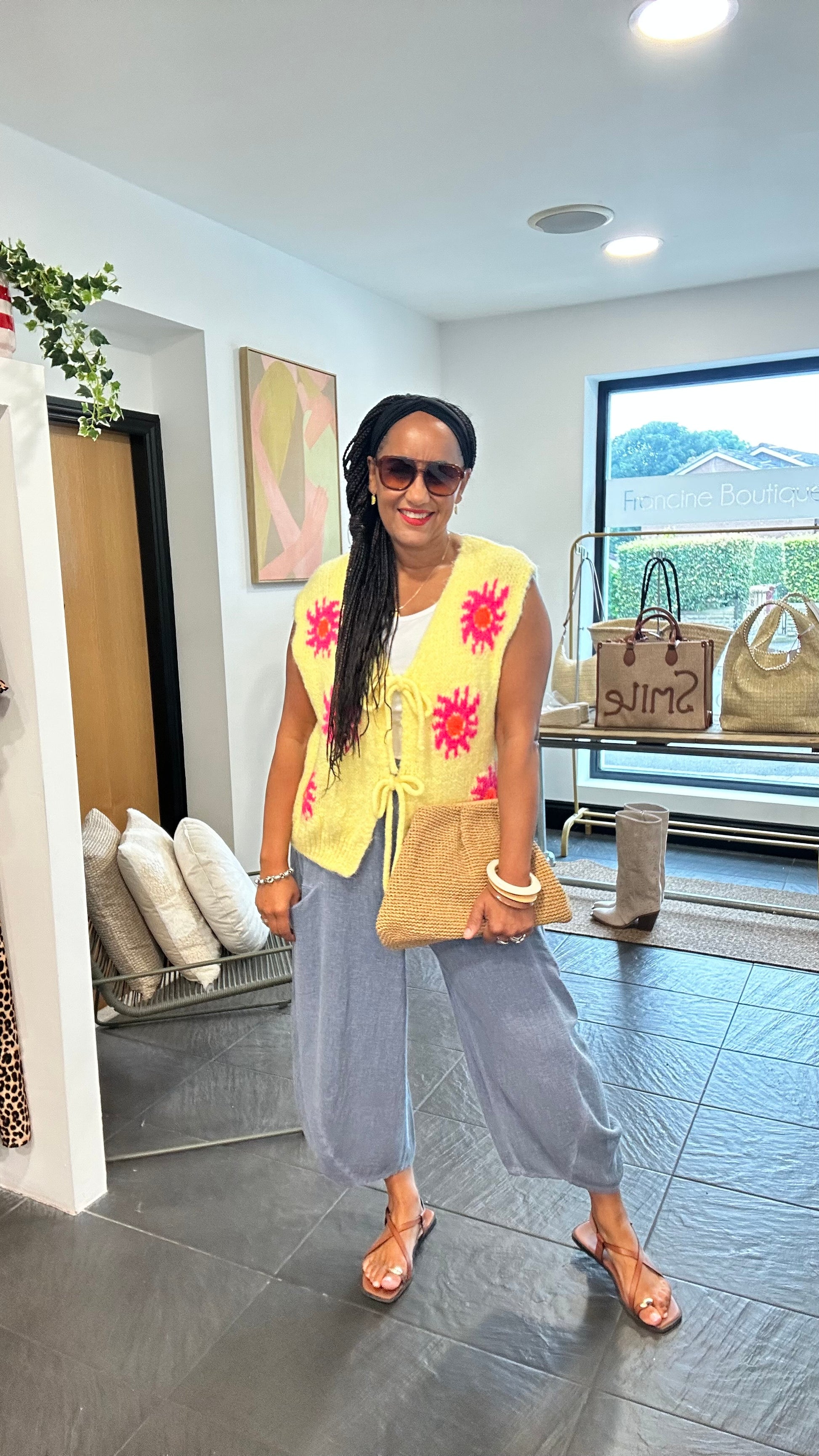 Available in three standout shades, Candy Pink, Natural Oat, and Sunny Lemon, this gilet brings a splash of sunshine to any outfit. Pair it with wide-leg trousers or casual denim for an effortlessly cool, boho-inspired look.