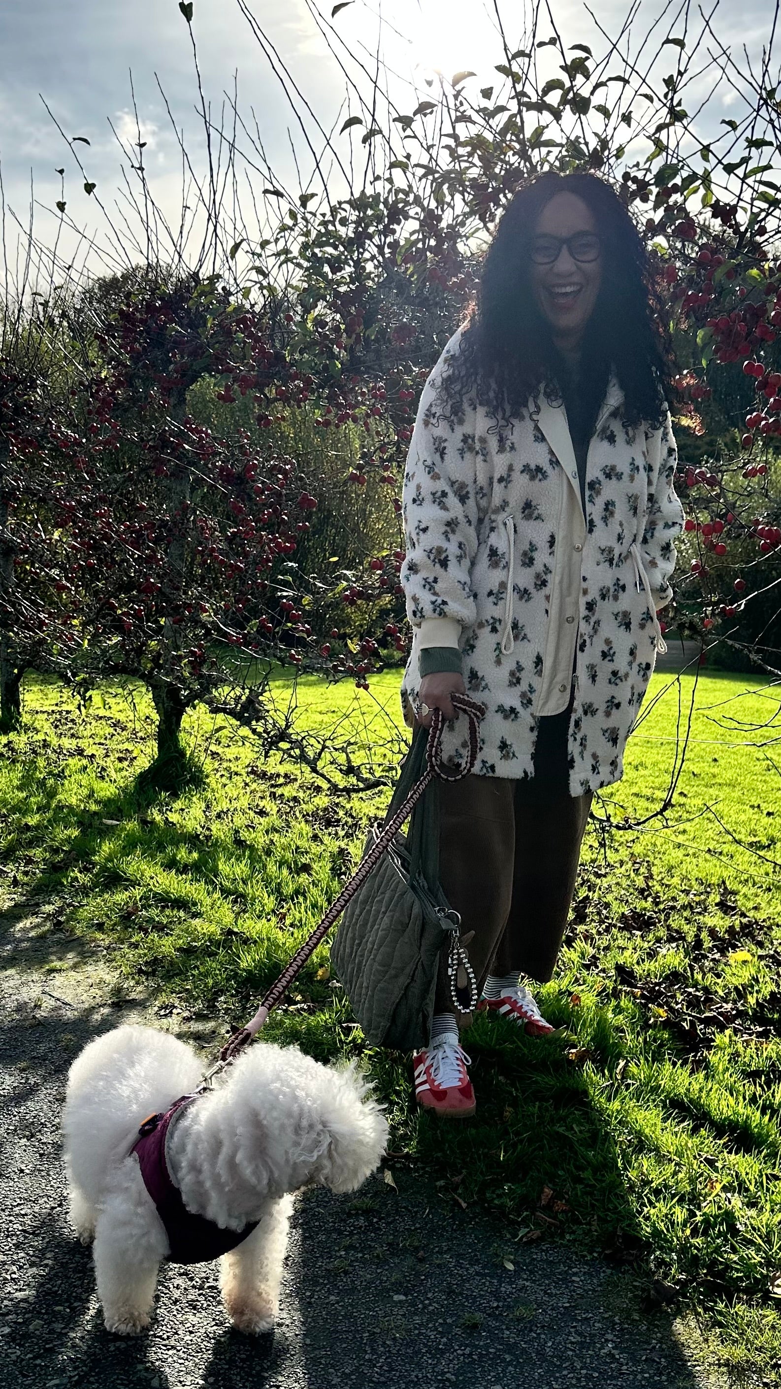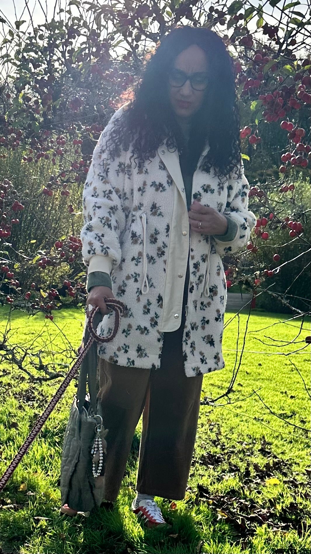 A cosy take on a parka silhouette. This fully-lined teddy coat is printed with a soft floral scatter and finished with silver hardware for a polished contrast. It features a funnel neckline for warmth, snap-press closure with concealed zip, and an adjustable drawstring waist to shape the fit. Front pockets add function without compromising the plush feel.