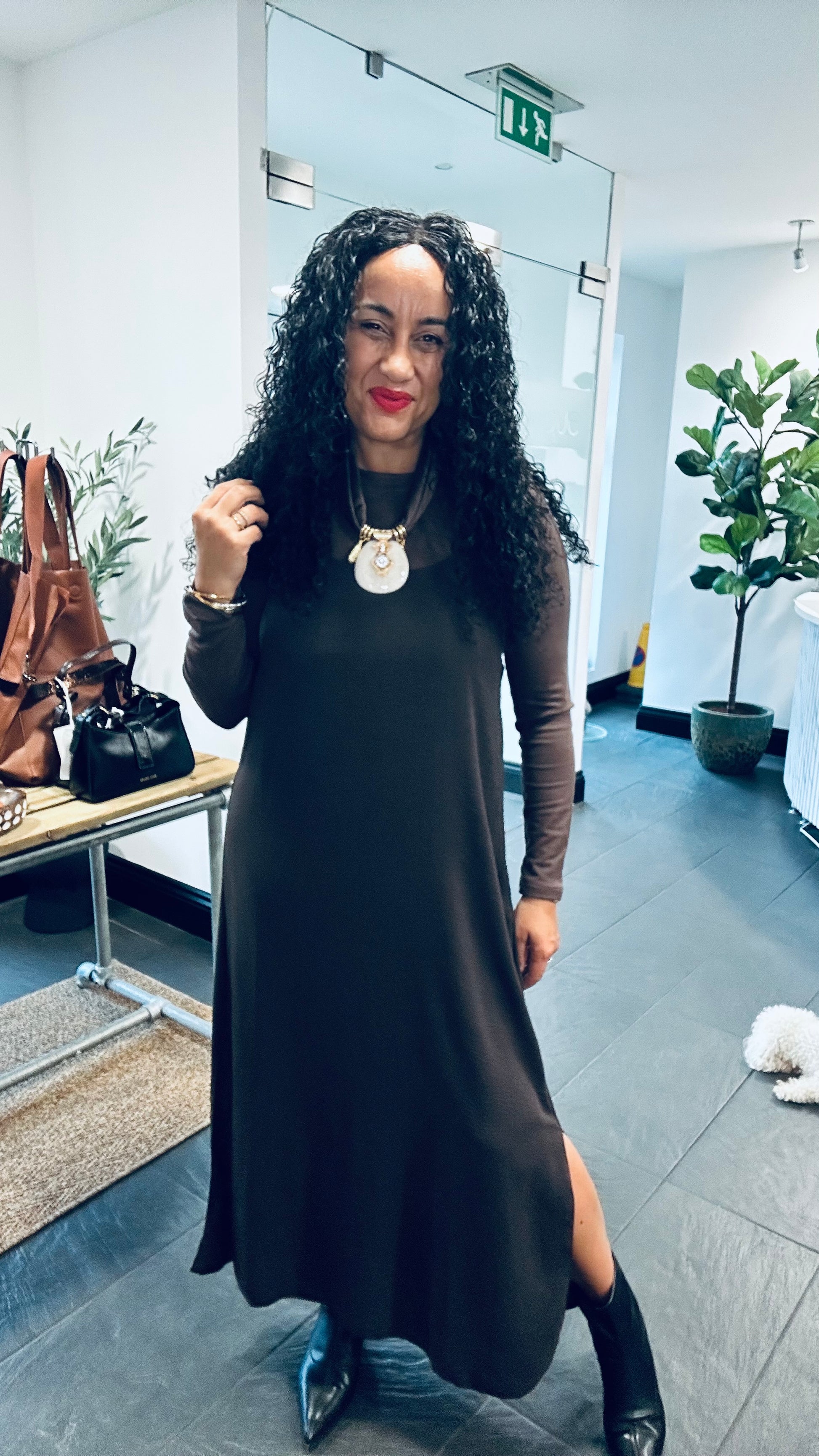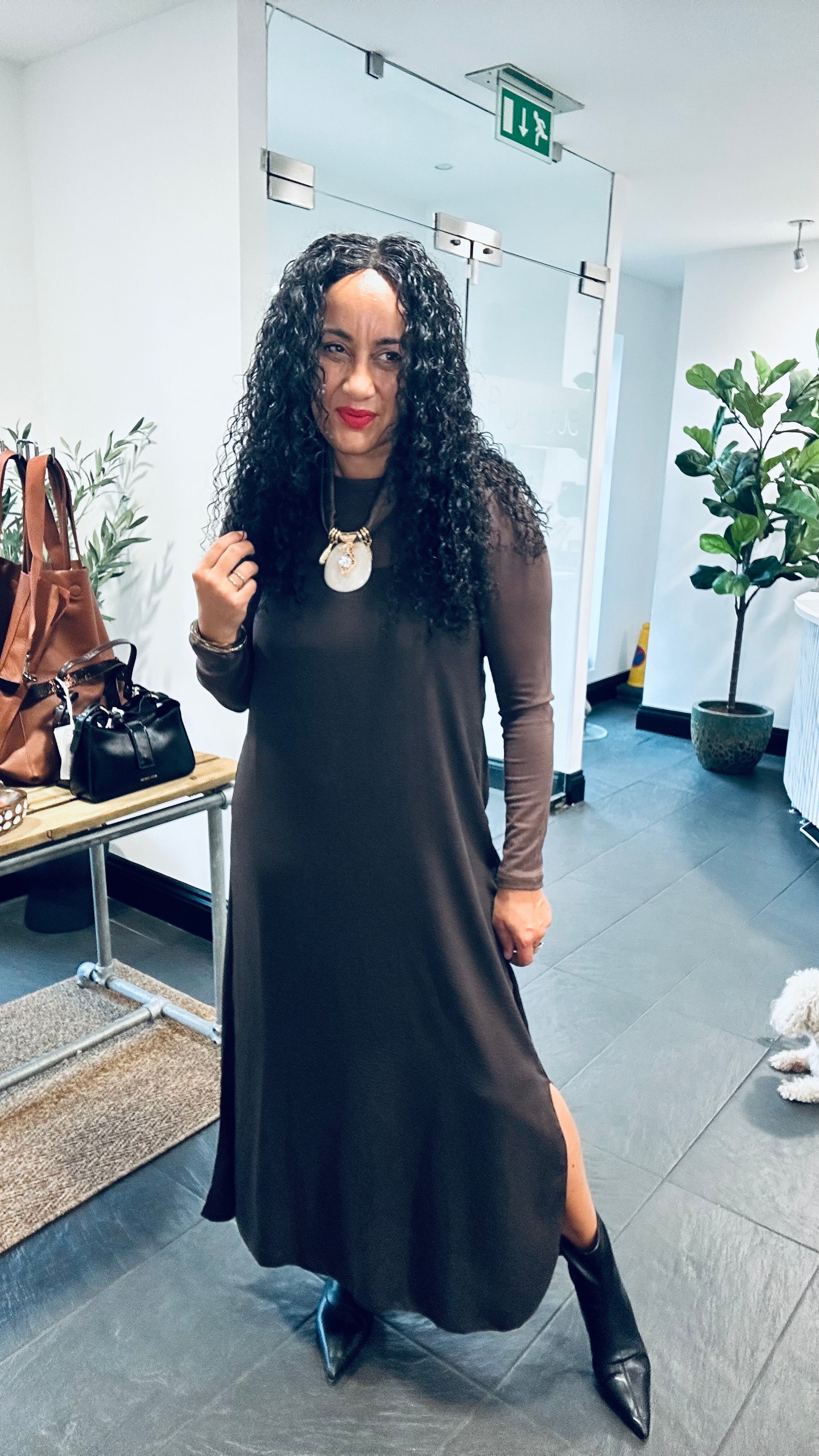 Modest side splits on each side add just the right amount of movement and ease, making this dress perfect for both casual outings and dressier occasions.